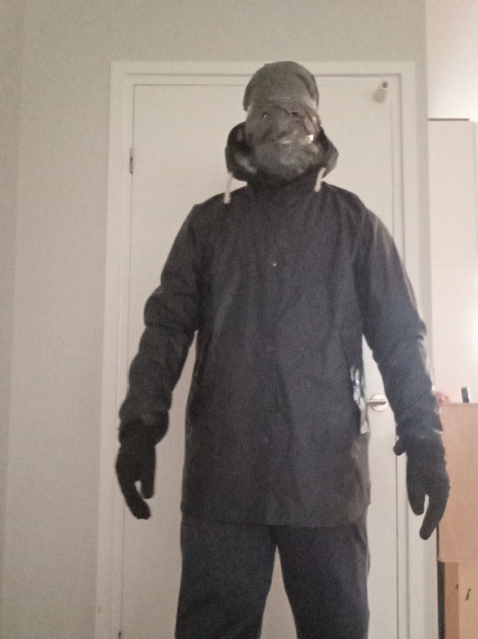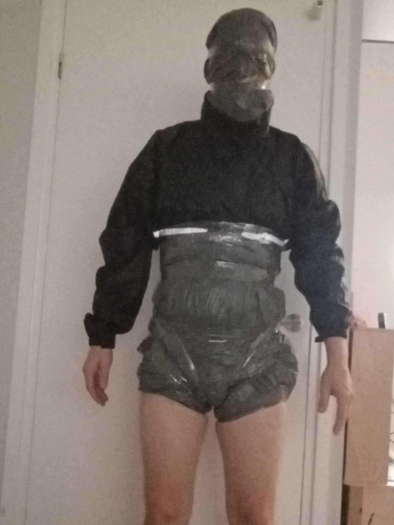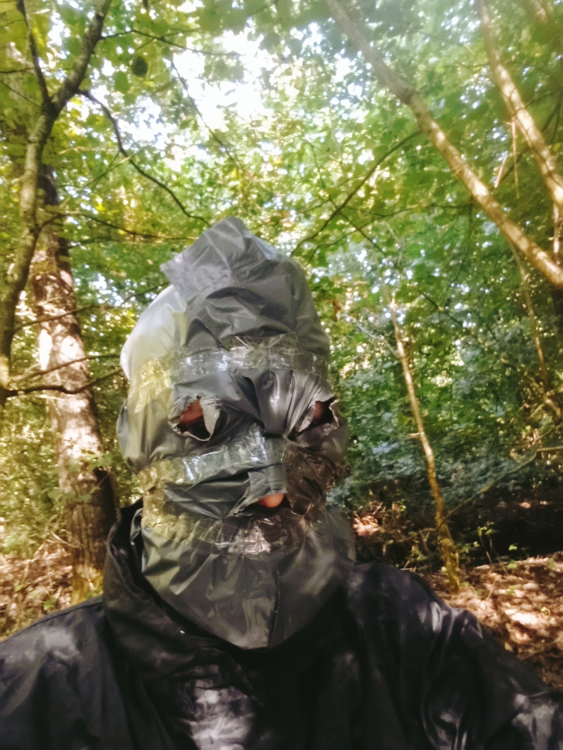 It's easy. Cut a small nose hole in a trash bag. insert the nose so you can breathe and fix it into place using a strip of tape over the nose bridge, around the forehead and over the upper lip. Then, using your fingers (no knife!) cut small holes for the eyes. The rest of the bag goes into the collar of the rain jacket, sealing in the mouth without a gag.