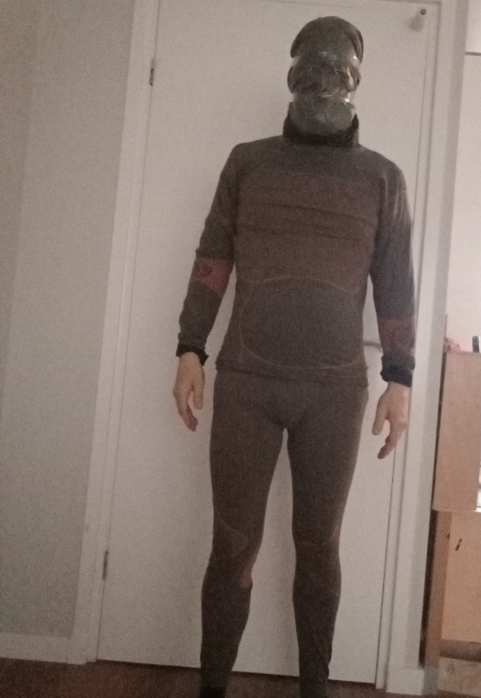 The jacket goes on first, then the pants. Using packaging tape generously, I taped both parts together, creating an one-piece suit .*3