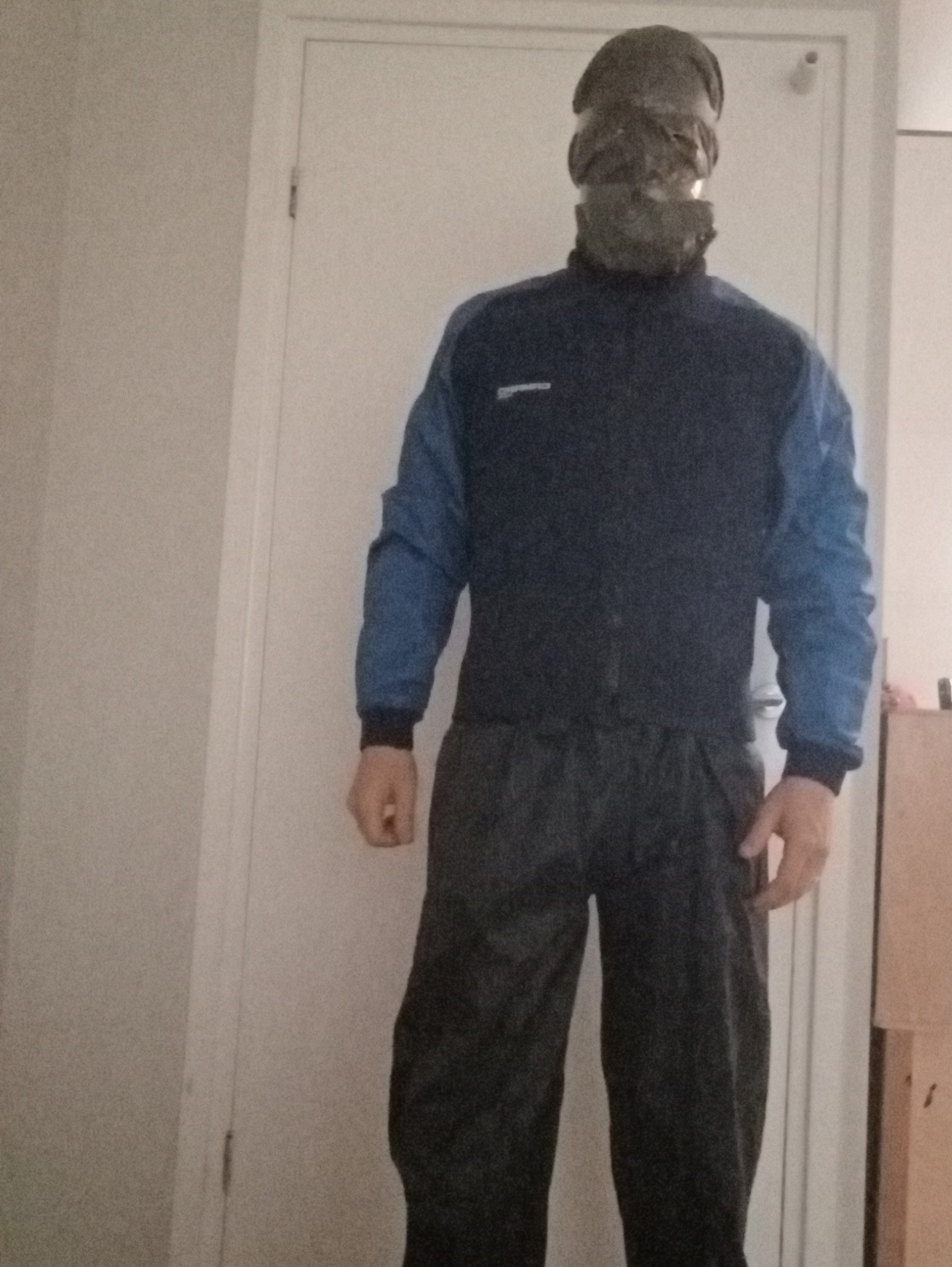 Secondly, I donned my first pair of gloves (latex ones) and taped these to the sleeves of the suit. When I start taping around the elbow up to the fingers (leaving the thumb out) this creates a very fine seal!