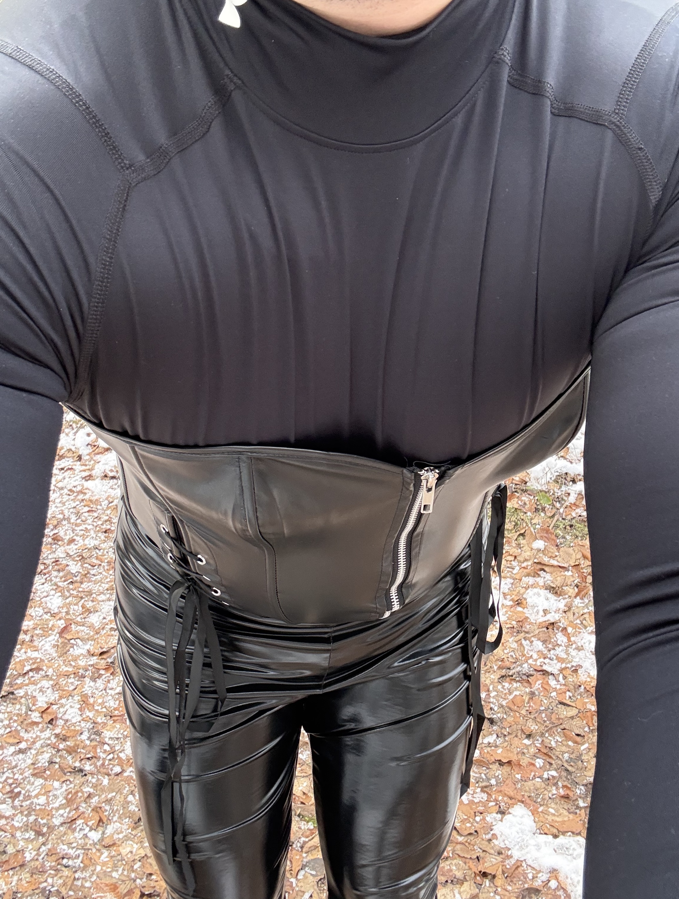 Another outdoor walk in several layers. Two layers pantyhose (thermal + normal 20 den black), black leotard, UA heatgear longsleeve t-shirt, H&M latex (PVC) leggings, woman's boots, corset from Temu. Wanted to wear a latex mask (balaclava style) but still waiting for the package from vinted, a bit more work for delivery services right now.