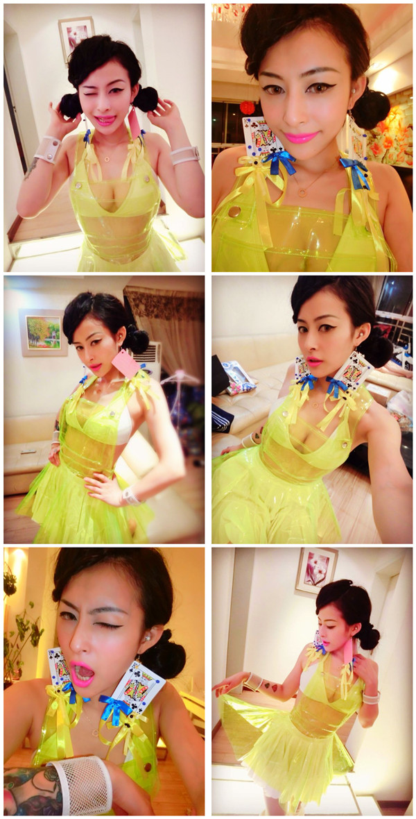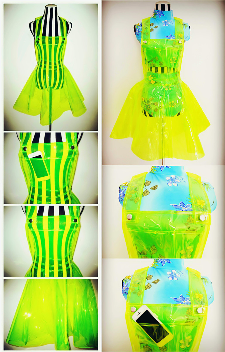 What a poisonous-looking dress! Transparent fluorescent pink or "uranium glass" yellow-green plastic dress