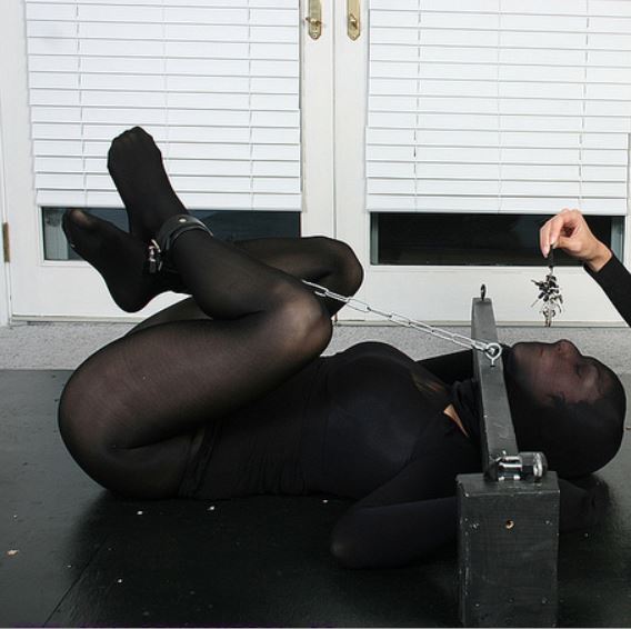 I see self-bondage possibilities her. I tried one-(single?)pantyhose mummification but it was nor quite clear how to make such self-mummification "less escapable". This is similar to the "pantyhose spread eagle" method.