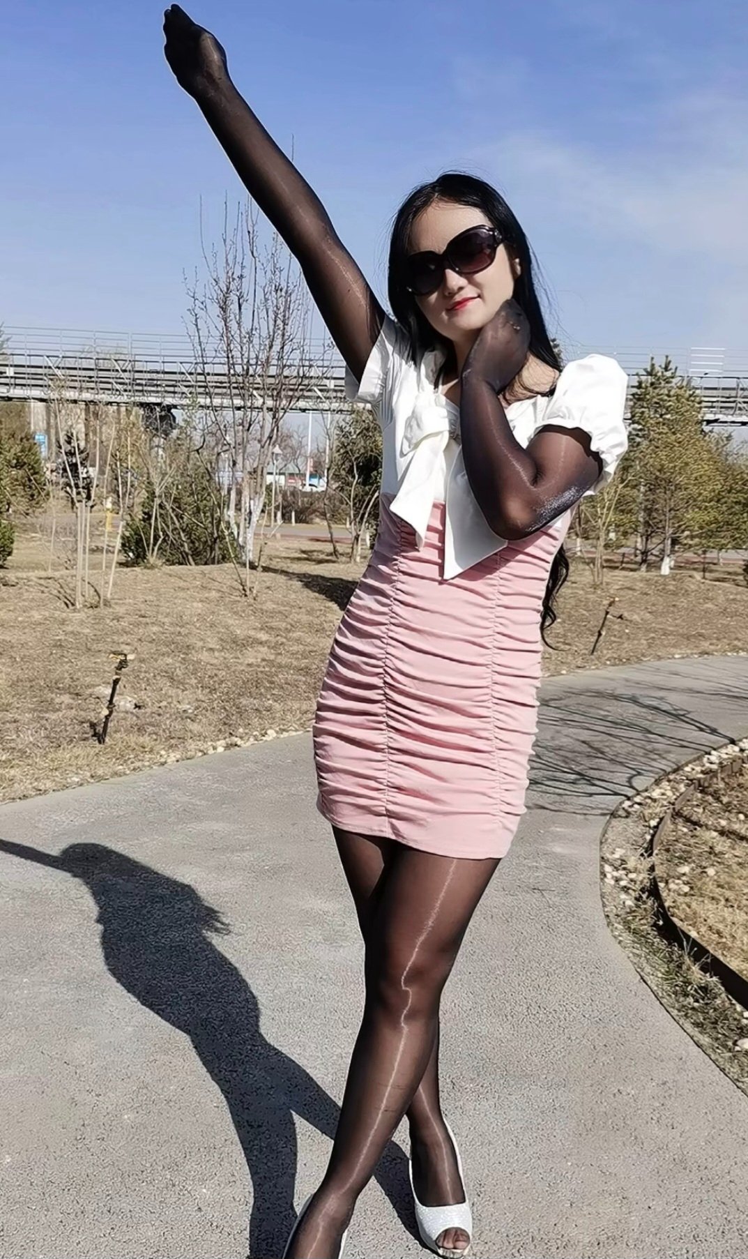 Correctly shiny pantyhose correctly worn on legs and arms: