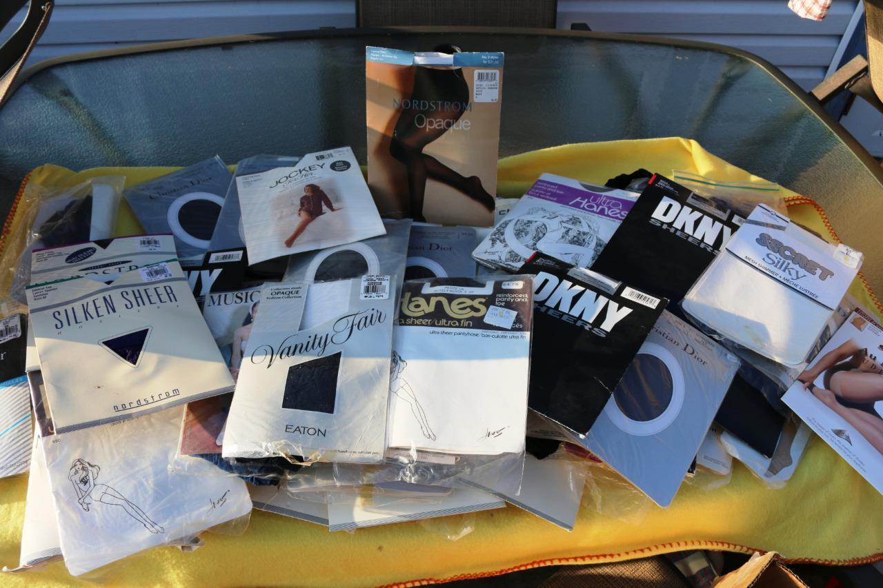 Got my eBay vintage pantyhose haul today - about 65 pairs! Lots of nice brands including DKNY, Nordstrom, Christian Dior. It was advertised as "new in package" but some have holes/runs (the previous owner used nail polish on some to stop the runs) and others have pantie liners stuck to the crotch gussets! Weird why someone would put the pantyhose back in the package with holes/runs instead of trashing them. Oh well I don't mind wearing some "previously enjoyed" pantyhose!