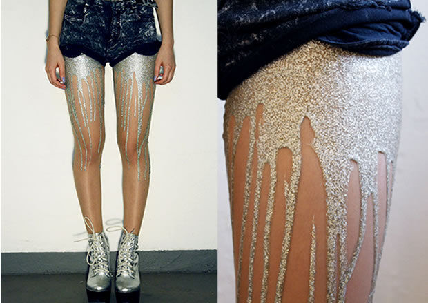 Very unusual pantyhose: Sheer flesh coloured tights with silver glitter latex drip effect from the upper legs.