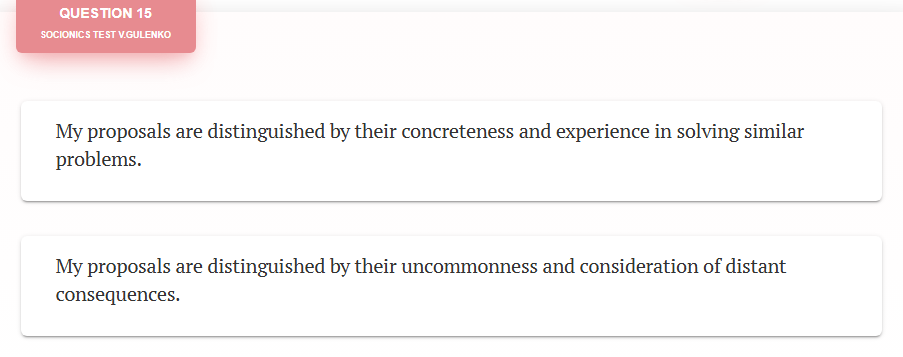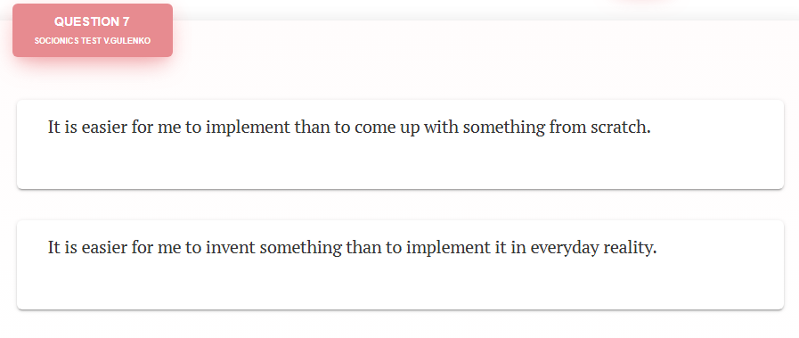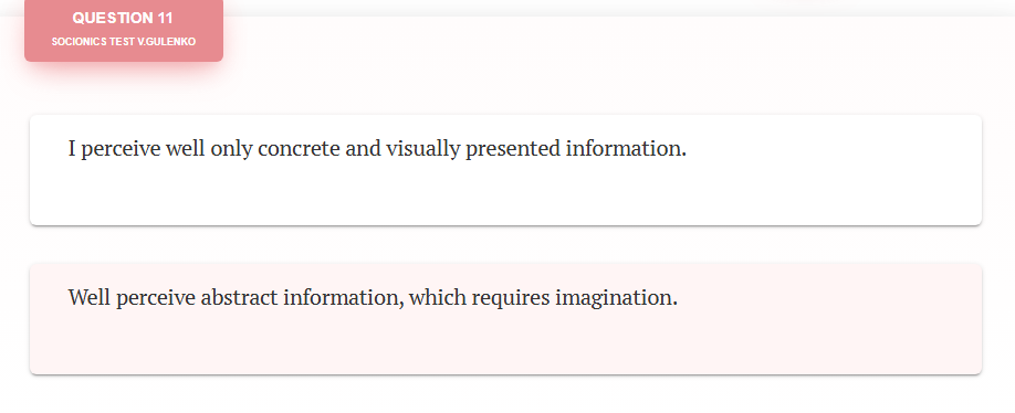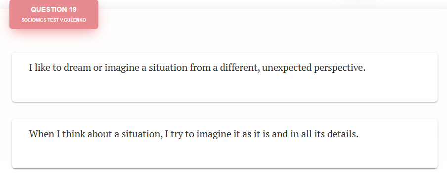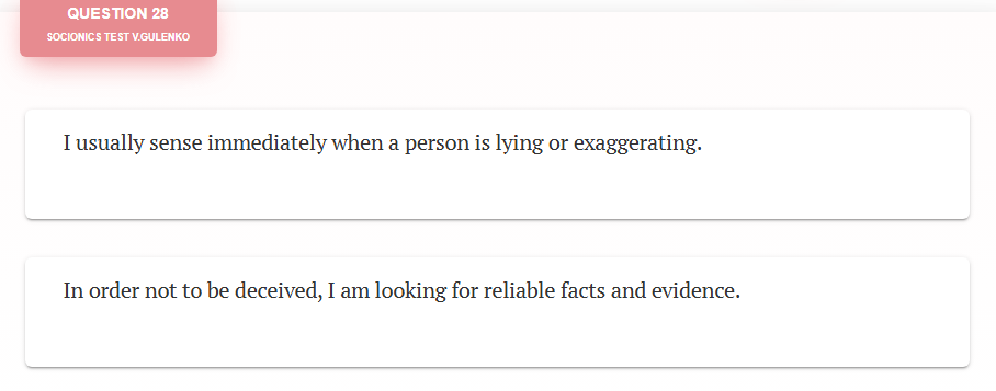 @Like Ra What does this even mean? Taking Socionics test right now & what is up with the very specific "one vs other" but 50/50 chance? On a very general global type it may narrow me down but never on a detailed introspective way as its granularity is just too low.