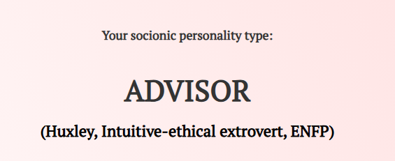 Interesting... I need to think about it... (As I never thought about your type before 😁). BTW, if you are ENFP/IEE/"Huxley", you might find the whole subject of socionics, psychology rather interesting. Possibly, not the typology itself, ENFPs usually do not need a typology for people, they remember them and generally understand them without any typologies. They can swear by the typology, though, if it's adopted/approved/blessed by highly authoritative, well known professors (and blame all other typologies).