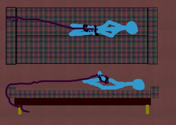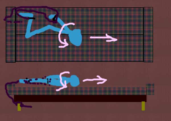 The situation now was like this: Ankles tied together, the rest of the rope from there leading between my wrists (behind my back), over the wrist tie and then down over one side of the sofa to the nearest sofa leg. I was on one side, knees bent and directly at the side of the sofa.