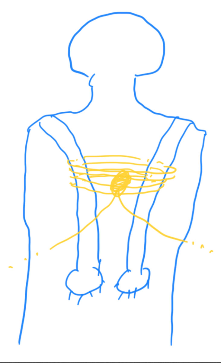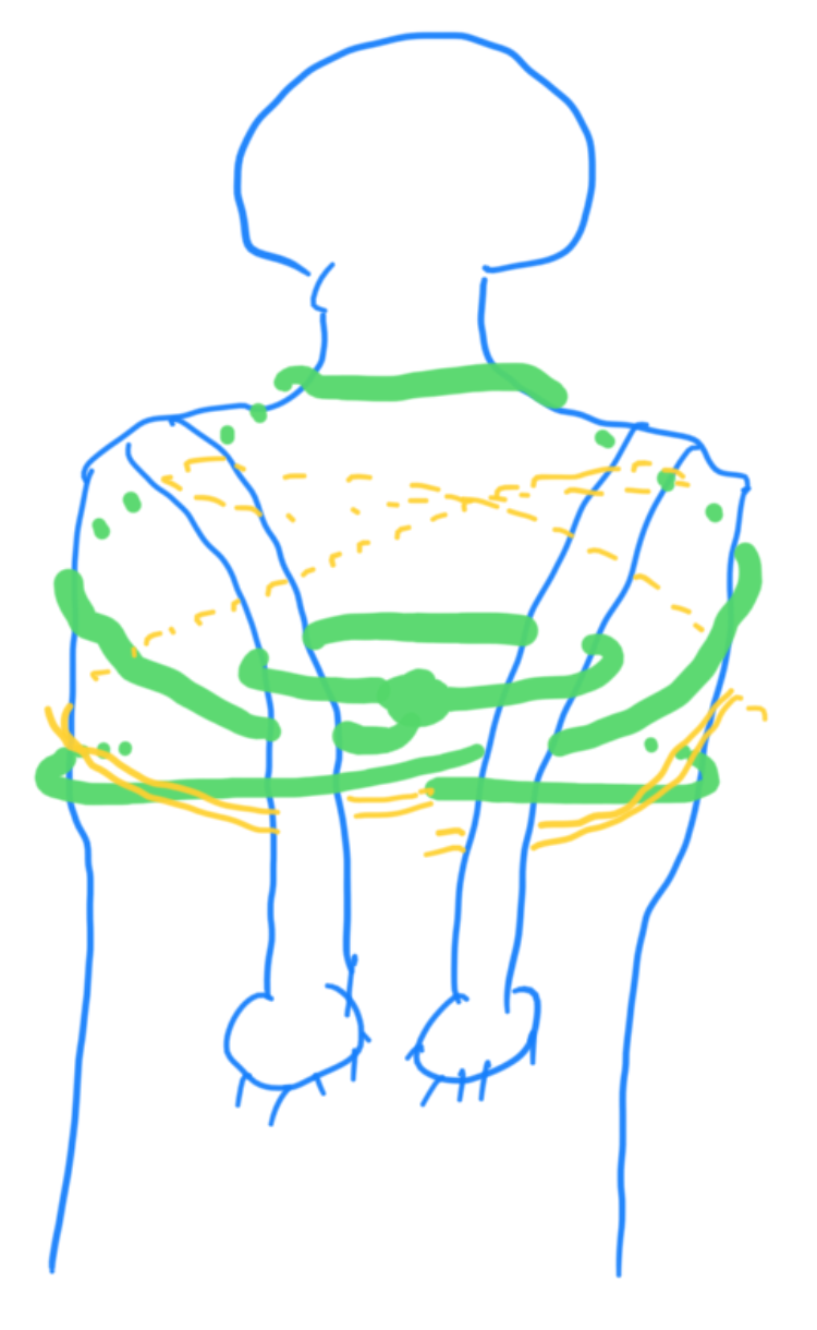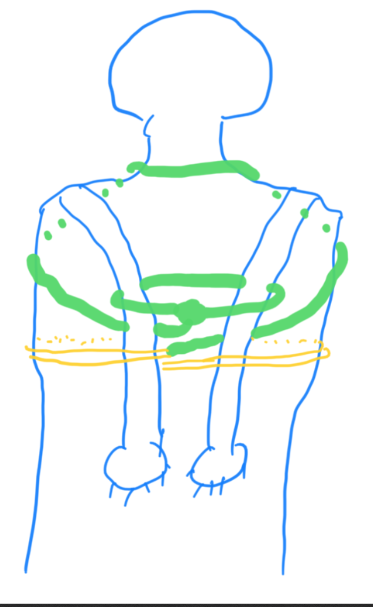 6) the way to finish it depend on how tight you made step 2-3-4 and the length you have left. I usually separate the two threads here, go under every rope between arm and back (on thread on the left, one on the right) and make a knot in front of my body. But if well tighten, I can still go back behind my back and make the knot there so I don't lie on my front with a knot pushing on my chest. Note : the more you tighten these last 2 steps, the less you'll have nerve pressure because it will bring the elbow loop up)