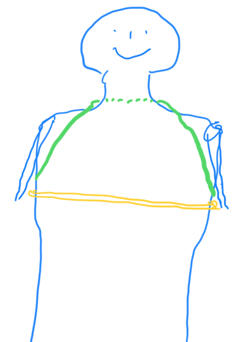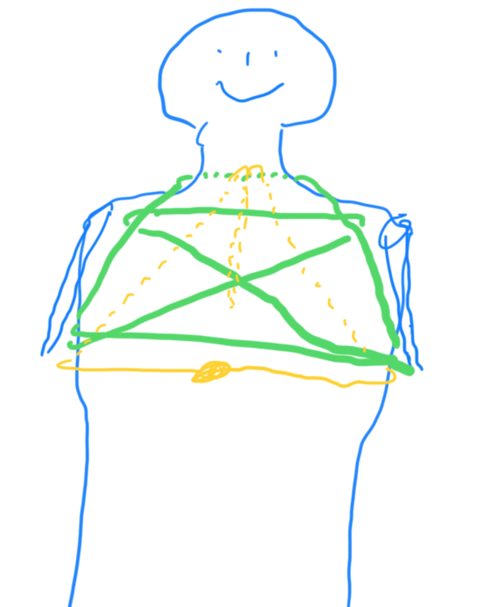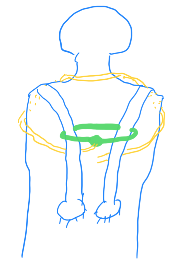 4) continue between the left arm and the back, go under the body loop (step 3) and go up to the right shoulder/neck loop (step 2) -> going through get back to the left shoulder/neck loop (step 2) -> and then continue between the right arm and back. (Prevents the body loop from sliding down)
