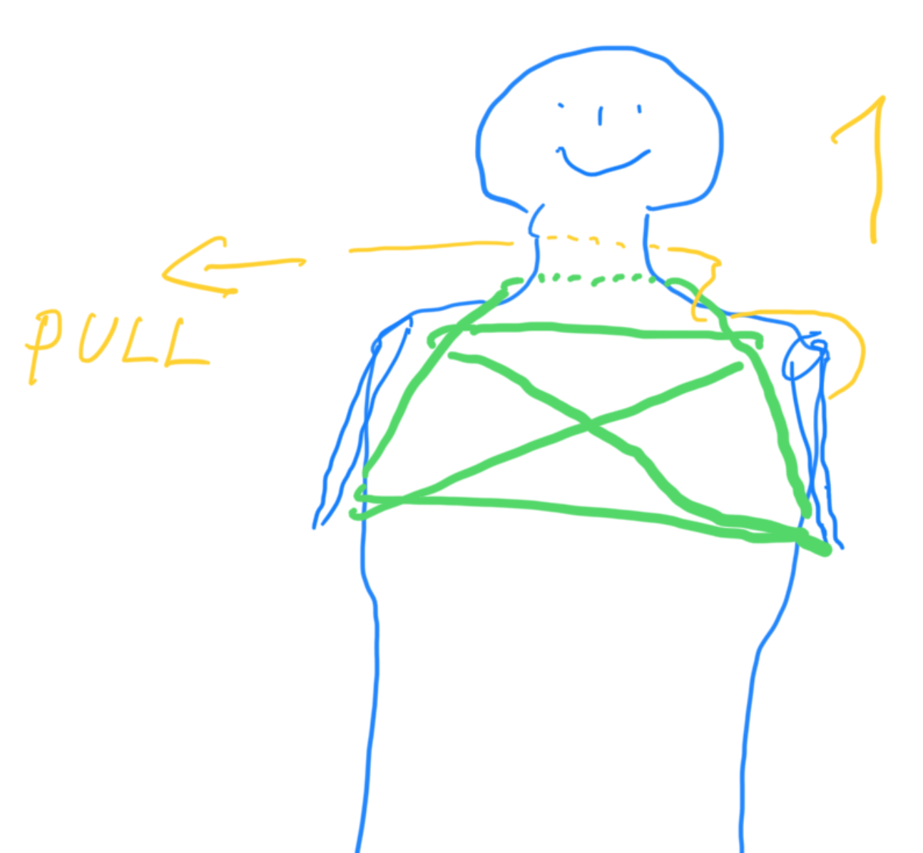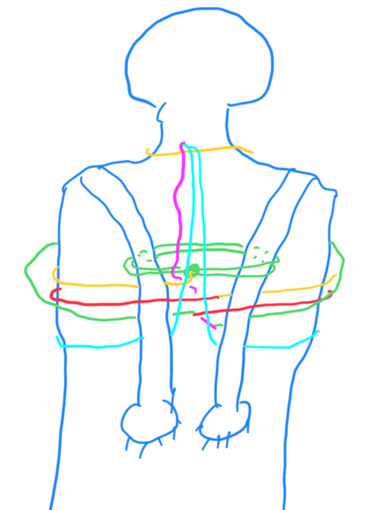 5) the trick here is to go through the thread going from the elbow knot to the shoulder/neck loop (Prevents the elbow rope to turn around). Then, go outside (this is where a place a little rope with a single ring device for either my legs or my wrist loop), up to the neck loop and back again. This is doable by passing the rope under the neck loop on front of the body, then sliding it behind (pulling with the opposite hand). (Prevents the back from going down, secure a single ring device and tightens things up)