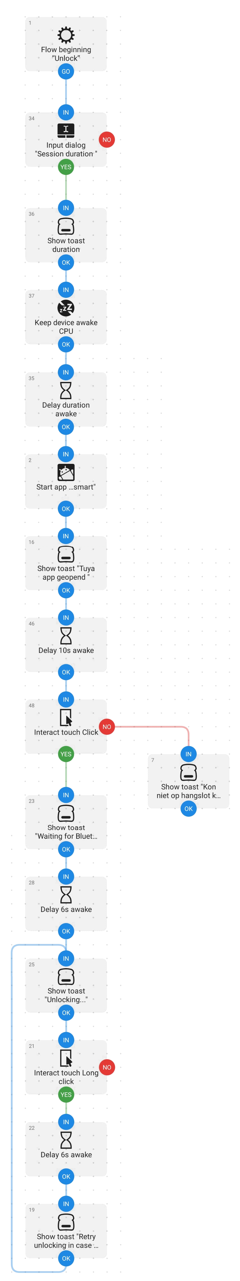 (07 Mar 2024, 12:41 )Like Ra Wrote: @Anne - could you please post links to the padlock and the software? For a quick reference? And, if possible, how you feel this type of padlock compares to the 'digital timer' types - maybe some pro's and con's? MJ (07 Mar 2024, 12:41 )Like Ra Wrote: @Anne - could you please post links to the padlock and the software? For a quick reference? (07 Mar 2024, 14:30 )madjack Wrote: And, if possible, how you feel this type of padlock compares to the 'digital timer' types - maybe some pro's and con's? Alright, a quick compare first. On the low end, around 10€, we have these: These are absolute crap, don't buy. Battery will die after a few recharge cycles, a small force on the wire will prevent them from opening and a moderate force will break them completely. Even to lock cuffs, gags or masks these suck. One step up, around 15€ there is this: These are toys, not locks. Won't open if there is any force applied but with some careful consideration they can be used. There are techniques you can use where there won't be any force on the lock, I have used these in a few of my videos, and the locks can also be used to lock cuffs, gaggs, masks, ... The main advantage of this type: easy to set timer Disadvantage: build quality not very good, battery not good quality, takes a while to fully charge and doesn't hold charge very well after a few recharge cycles. The internal beeper broke on both my locks so I'll have to listen for motor noise if I lock them blindfolded, it does not spark confidence so make sure you don't rely on these alone. I usually use 2 of these in series so I still get out if one fails, with another backup release of course. On to class number 3: These are proper locks that are meant to be used where you would use a real life padlock. Ranging from around 25€ to 50€ and beyond depending on waterproofing and features. These are smart locks that work with Tuya, you can unlock them with an app on your phone. They require bluetooth but I also bought a Tuya hub for 20€ that bridges to wifi. The bridge appears to give me a more reliable connection as the bluetooth connection to my phone kept dropping and reconnecting every time was a pain for the script, the hub keeps the connection alive. You don't actually need the hub, I wanted it to experiment, you could use it to control a lock with Alexa but I didn't try that. These are the ones I have: https://nl.aliexpress.com/item/1005004781468949.html https://s.click.aliexpress.com/e/_DDhYcgt https://s.click.aliexpress.com/e/_Ddun3C5 the hub (you don't need this): https://s.click.aliexpress.com/e/_Dd4ndXF Unfortunately the designers/programmers didn't see the need for any automations for the padlocks so they can't be controlled like you would control lights or power sockets, ie turning them on and off with a simple home automation script. That would have made my life really easy. In stead you can only unlock the padlocks by holding a button in the app. To automate opening the padlocks I wrote an automation script in an app called Automate by LlamaLab: https://play.google.com/store/apps/detai...b.automate A few warnings before I continue with the script: - I wrote this script for my phone and it's only tested on my phone - I scripted tap and hold events, nothing smart so a popup or incoming call on the wrong moment will mess up script execution - You can't put your phone in airplane mode to get around this because you'll need bluetooth, which will need wifi also for some reason - IF you use the hub you can disable 4g, bluetooth and only keep wifi enabled, put your phone on no disturb and chances are nothing will pop up - the Automate app requires a lot of permissions - I use a spare phone with no sim card for this - if your phone has a different screen size it will not work - everytime Tuya updates the app this script will possibly break - commercials in the Tuya app can mess with this script, I have pi-hole running on my network but if I'm on 4g a large add can mess with the script - I test this script every time at least twice before every session - you will get stuck if you rely on this script Ok so this is what I got: WARNING: There are many ways in how this script can be improved, mostly in how to handle unexpected situations. I am not going to explain this script, not because I don't want to but because if you don't understand what this does you have no business using it for something as risky as self bondage. What's next? Yesterday I made good progress on a Python script that uses Android Debug Bridge (adb) to control an Android phone. There I have much more control on checking what is actually on screen and opening the exact activities to get to the unlock screens for the padlocks. Also a lot more options for handling unforeseen situations. A first proof of concept is actually running so I have good hopes in getting this to work. Because it's Python it opens up almost unlimited possibilities. Hand control over to a website? Only open the locks once you reach a certain location in the room? You need to solve a puzzle first? Stand in a certain position for 10 minutes?