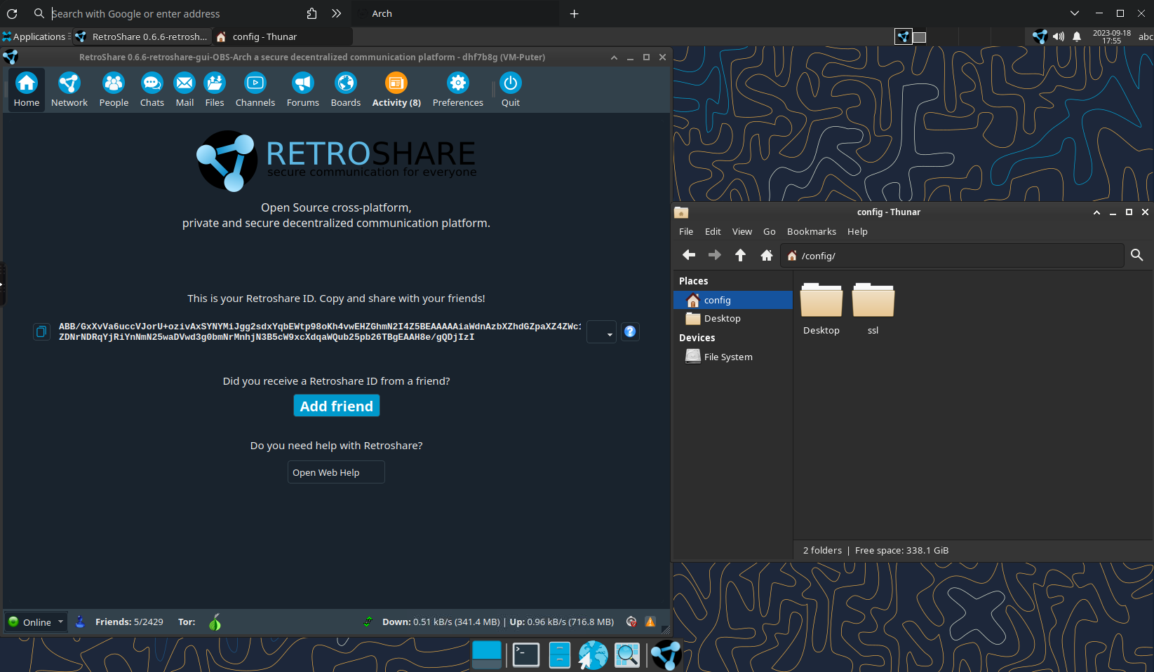 (18 Sep 2023, 11:19 )Like Ra Wrote: Why did you have to compile it? There are precompiled packages. What OS are you running?I use alpine for all of my single use docker images because its just about as minimal as you can get. It sadly doesn't have a retroshare package. The "solution" is probably better than what I could have achieved with the webui anyway so I'm not really bothered. Fully featured linux desktop environment running inside docker, streamed straight to a web browser so I can use it for anything else that comes up if its annoying to run headlessly. (see image) Retroshare uses more resources than I initially thought, probably since I just didn't notice any extra usage when it was running on my desktop. TOR has one of my server CPU cores at 100% pretty much all the time. I'm not short on ram so I don't really care about how much it uses there but my server cpu is only 4c/4t so I might need to do some performance limiting on the docker side and check how that impacts network performance.