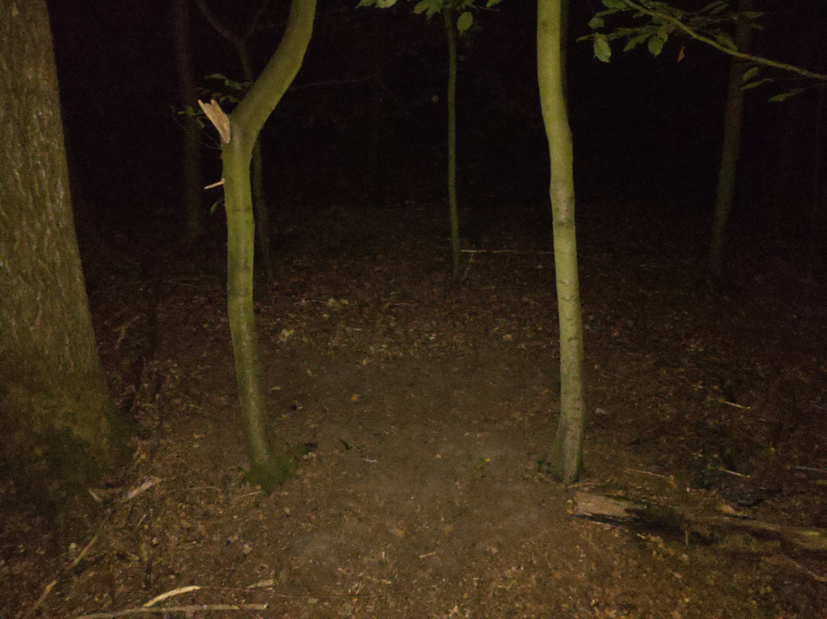 Hmmm. Looks like someone has scouted this area of the woods and cleared out some of the leaves between these two trees. I wonder why ...