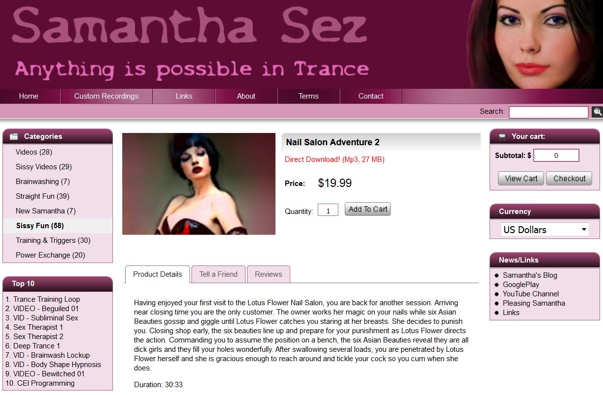 I discovered her stuff around the same time I discovered sissy hypno in general, including Bambi Sleep, Dolly Dreaming, and others on You Tube. I liked SB's videos, and found them sexy, but no trancing from them. Mainly I liked the collection of images, the overlaid voice of Samantha, the sounds of female pleasure in the background, etc. Eventually I visited her site, and was blown away by the amount of files there to choose from. It was too much and I didn't know where to begin. I emailed Samantha and got some advice, based upon my interests (Dress up 1 and 2, 2 on 1, etc.). The file that really impressed me was "Samantha Sez Sissy", which I found on an erotic hypnosis site that had a large collection of misc files, including about 10 from SB (Pink Collar series, Bed Over, Sissy Time...). I think I might have heard this one before I purchased from her site, I don't recall. Regardless, this was the older version that's not for sale on her site anymore, has reversed audio tracks and is longer than the current version. It also has a background track of female moans, which the current one doesn't have (I purchased the new version thinking it was identical to the one I found for free, to "be fair to Samantha," and was surprised it wasn't. The older version I like better). Anyway, I put on the file and lay down on my bed. There was a long induction, with the story about a person going to a new city, learning the new area, etc. It was a slow and subdued induction, and did a great job of putting me into a trance state. When the file really began with the sissy addiction content, it floored me. It was overwhelming. I felt pinned down, but in an exciting way. Samantha was hitting on all these really exciting themes, especially the idea of being unable to stop, and soon I will have to choose a sissy name, and recite it while masturbating, which will lock in the training. I had a huge erection, but felt I couldn't move to attend to it. Finally, she ordered me to tell her my sissy name, which would make me under her control as her sissy. I couldn't say it out loud, since I felt a bit worried about being "her" sissy and what that would actually mean, but I was able to finally move to my cock and "take care of business." That was an extra intense orgasm, for sure! I remember laying there in a stunned state until the final section wrapped up. The file really delivered, and I was soon to buy more. A couple years later, after a break from SB and hypno stuff, I was lured back in and purchased the Trance Training 1-7 files. I decided to do it as recommended, and listened to each file exclusively for at least 5-6 times before moving up the progression. When I listened to file 4 for the first time, she installed the "Ecstasy" trigger, which was very powerful for me. Files 5 and 6 got progressively sexier, and I definitely felt like I was trancing during them. In file 7, I had my first HFO. I remember the file starting, and I immediately felt like something was different about my experience. Her layered words were hitting my like a semi truck, and seemed very loud and powerful, controlling me in an exciting way. I felt bombarded by her words. My body started to vibrate and shake. My eyes rolled back. I noticed in my hips a small feeling that slowly got bigger. I was aware enough to recognize that it was pleasurable and was building to a potential orgasm. I realized it was actually happening, that there was nothing to stop the outcome I craved. Soon gushing pulses of semen were shooting out of me as I lay locked in place, seemingly pushed into my mattress. I couldn't move until the file was completed. Holy shit, that was intense. And I came in like the first half of the file, before the really sexy part. Unfortunately it hasn't happened since then. I have purchased many of her files now, and really like most of them. I wish "Rewarded" delivered on the promise of coming on command, though. I have probably listened to it about 30 times, and still no release upon hearing her command me to Spurt. Anyone have any advice? Does this file work for you to install that command? I'm not sure if I am doing something wrong, but usually when listening these days I am just a relaxed puddle of a human, and I don't know how an orgasm can occur while like that. |