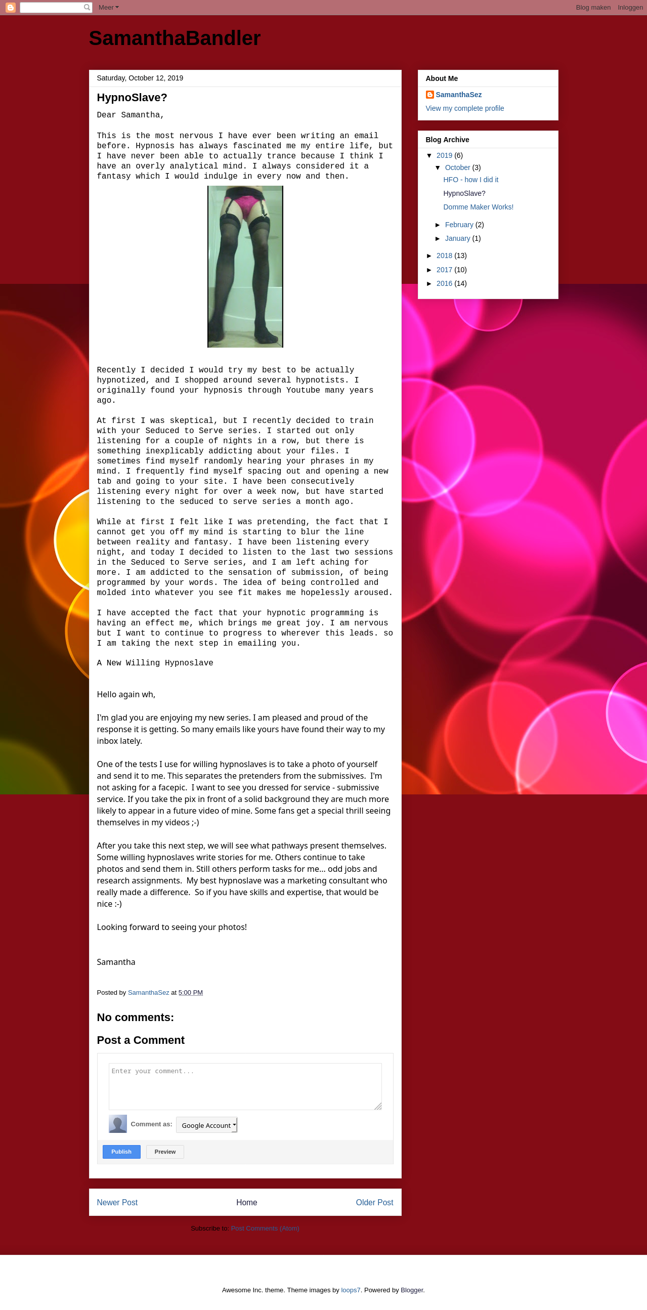 I wish we could reach for more Patreon/SubscribeStar/5amantha5ez supporters to share their experience with new files, conversations and stories. (31 Oct 2019, 19:28 )Like Ra Wrote: Quite a few guys here mentioned their talking (OK, messaging) to SB. What was it like? Did you feel anything? Was you told or asked to do something? How did you start the conversation?I want to tell people about SB and how great she is, I want to spread the word. Im scared however, what if SB finds out that ive been telling others her secrets and abandons me? (31 Oct 2019, 21:08 )hypnoslave16 Wrote: SB finds out that ive been telling others her secretsWhat secrets? 😊 You think SB told you (only you!!!) some secrets? Are you sure it's not the other way around? 😁 Or this is the Great Secret of SB you are afraid to speak about: (31 Oct 2019, 21:08 )hypnoslave16 Wrote: I want to tell people about SB and how great she is, I want to spread the word. 😁 (31 Oct 2019, 19:19 )Like Ra Wrote:(31 Oct 2019, 13:08 )Rami Wrote: I remember the gossip going around that SB liked the thought of you(the listener) being feminized or forced to and anything homosexual or bisexual related.Gossip? It's in each and every file 😁 Gossip as in actually happening irl. I think he doesn't really like it. Just knows there's a demand for these files, he's good at it, and that he can gain more than money off of it. Now as far as the money part, your reasoning is good. But I believe it's all about money. Fun fact. I once suggested a theme for a file. He said "that's a very good idea" and (I think) that he might actually do it. Turns out, it never happened. |