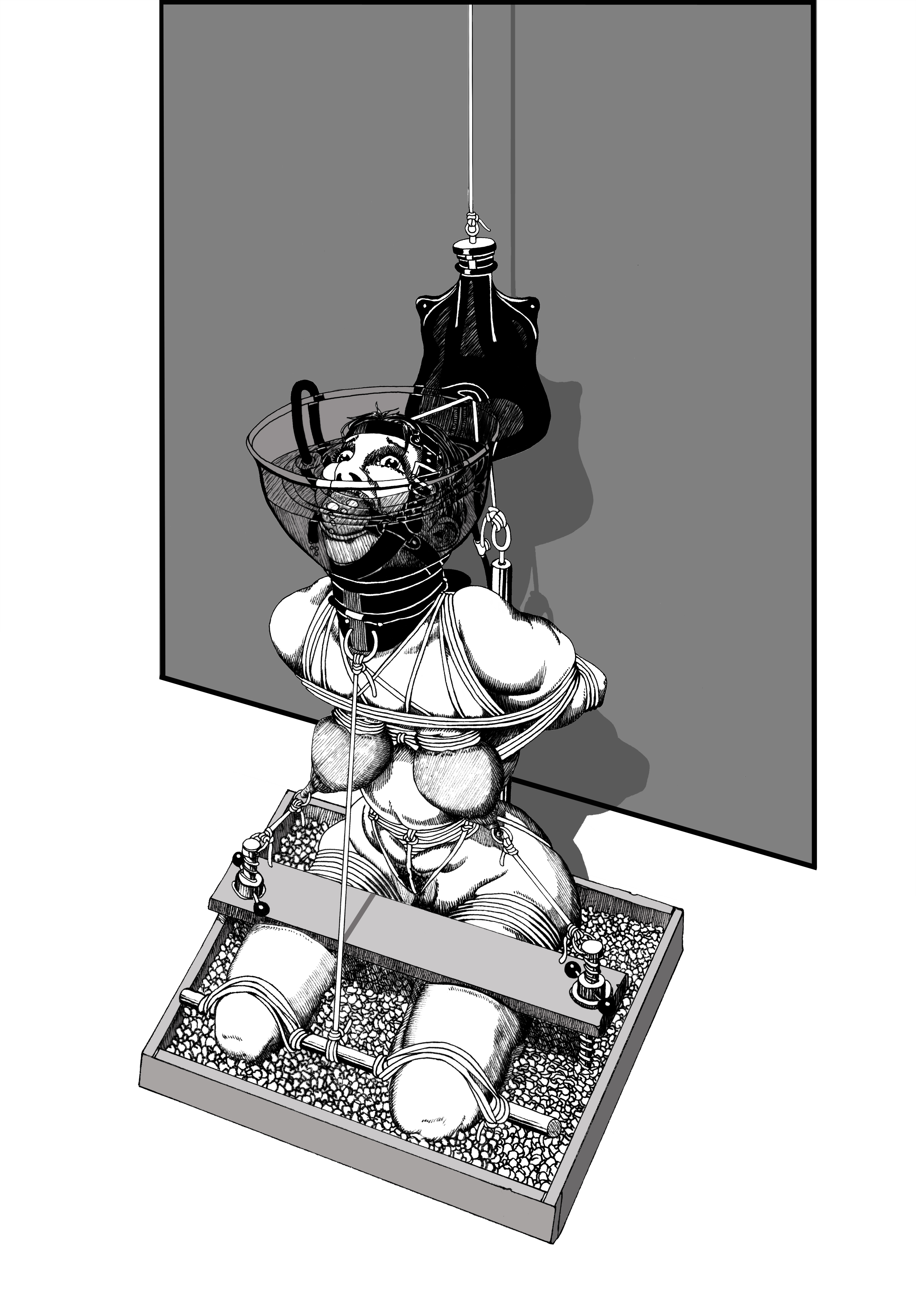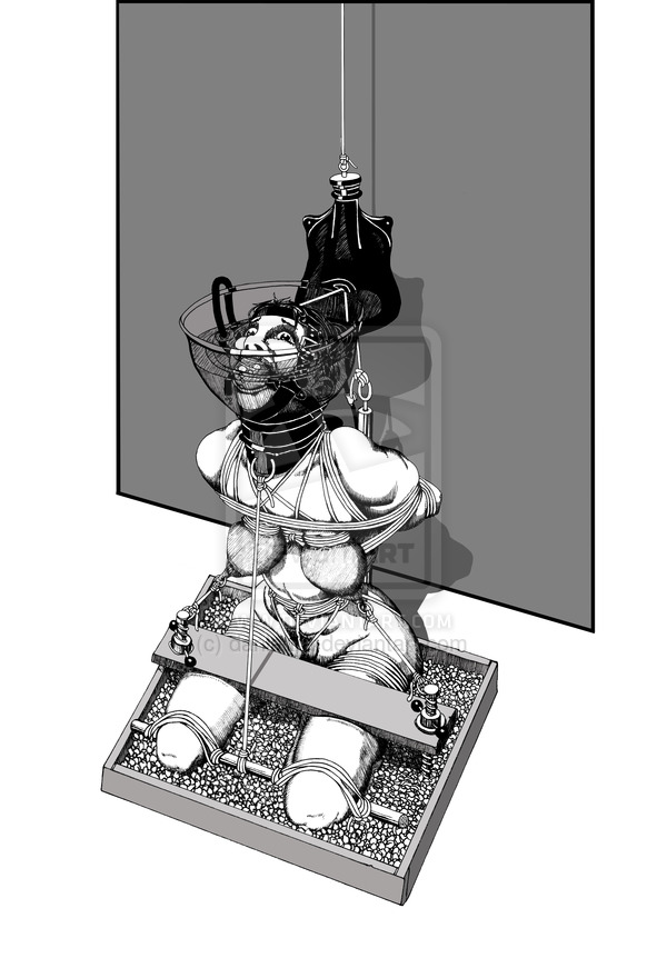Now Dan has his own description of what's going on, but I see a different story - in my imagining the delightful damsel has placed herself in this perilous predicament as part of a seriously heavy self-bondage session I spotted an ice-lock behind her back, ensuring she must stay bound for a few hours at least. Then there is a steady trickle of fluid (I wonder what sort) into the funnel collar around her neck. If she wants to be able to breathe as the fluid deepens around her mouth and nose, then she must keep emptying the collar using a valve by her bound wrists - But the only way out is through the tube into her enema plug. Breathing means taking an enema, taking the enema means more discomfort for her until the ice-lock releases. That enema bag still looks very full and also very large, I wonder how long she's been like this.... ? This awesome artwork is posted with Dan's permission (he very kindly agreed to share and amazingly sent me an copy of the image to post here - what a nice chap he is 😁 ) - so please take a moment of your time to visit his Danlaura Deviant Art site and his Bondage Drawings website Enjoy MJ