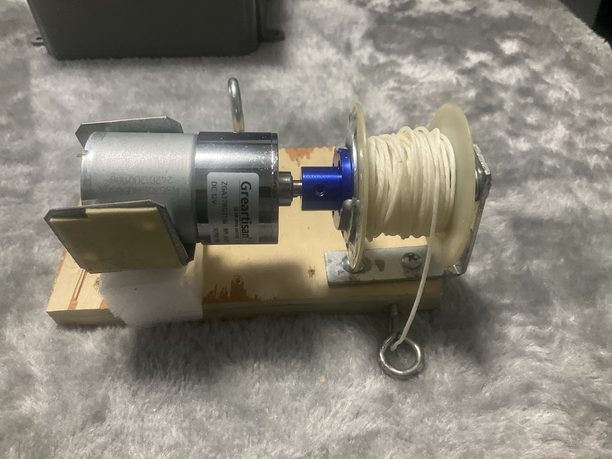 I wanted a string that you could put a key on. Then have it retract too far away for you to reach... then have it come back down to you when chosen.   Here I tried using a stepper motor to do it. Stepper motors are like normal ones except that they are very accurate about how they move. If it turns 10 times in 5 seconds pulling up, it'll take 5 seconds to turn 10 times coming back down, guaranteeing where it stops. This one didn't make it. So I replaced it with a normal motor, but one that had a "transmission" attached to it. This does a good job of restricting it to a steady pace, but with more strength than the same motor would have otherwise.