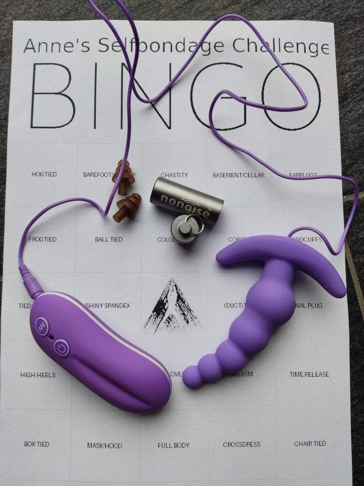 I had a lot of time to tink about this one before I got time to myself to play so I tried as a challenge to myself to tick as many boxes as I could in one session. It was possible to throw in "handcuffs" as well but I decided to fully commit to ducttape. No time release as I wasn't sure how comfortable this would be so I wanted to be able to get out at any moment. No orgasm because of the tuck, the vibrating anal plug doesn't do it for me I don't even know why I keep that toy in my bag.