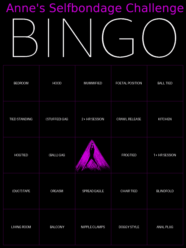 (10 Aug 2024, 16:04 )Anne Wrote: I just did a "regular" bondage session and I must say it did feel a bit uninspired, the Bingo Challenge did make me come up with new ideas and made me have bondage on my mind all the time. Can we come up with a new challenge or do another Bingo? (Not so challenging my neighbours have to call the cops again)