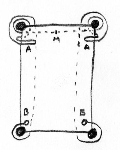 This method is entitled "Poor man's self-bondage", because it's not using any bondage-specific items and materials. 😊 You need: - A bed with 4 separated legs. - A long rope. ~ 6 meters. - 2 or 4 dog collars with buckle and D-ring - 2 small padlocks. Padlock ring should be small enough to pass through the buckle holes. - A sock, a smooth metallic ring, a cord and a large chunk of ice. What to do: - Install the rope under the bed and wrap it around the bed's legs. See the attached image. The middle of the rope should be at point "M". - Pull the rope from it's ends until the loops "A" are near the top corners of the bed. - If you have 4 dog collars, take 2 of them and tie the ends of the rope to the D-rings very close to the bottom corners of the bed. - Make a time release device using the sock, the ring, the padlocks' keys and the cord. Tie the sock to the rope near one of the "B" points and tie the end of the cord near one of the "A" points. - Lie on the bed. Feet near "B" points, hands near the "A" points. - Tie your legs to the ends of the rope ("B" points") using either the ends of the rope or the dog collars tied to the ends of the rope. Having 4 dog collars is more comfortable than using the rope directly. - Wrap (the other 2) dog collars around your wrists. Dog collars are too large for human wrists, so make additional holes for the buckle or wrap them twice around the wrist. - For each hand, pass the padlock through the dog collar's D-ring, through one of the buckle holes closest to the buckle (so that the collars can not be unbuckled without opening the padlocks) and through the "A" loop. See the second image. - Make sure you can reach the cord from the time release device and lock the padlocks. If everything went as it should, you are now spreaded on the bed and tied to it's legs. Escape will come when all the ice will melt and you can pull the keys to your hand using the cord. This method is safer than most other ice-based methods because the ice is tied near one of your legs. You could accelerate the melting by heating the ice with your leg, and, if something goes wrong and the ring gets stuck, you can reach and adjust it with your leg. Just make sure the sock is securely tied so that you can't untie it with your toes. (This post was last modified: 20 Jun 2012, 19:22 by Max515.)