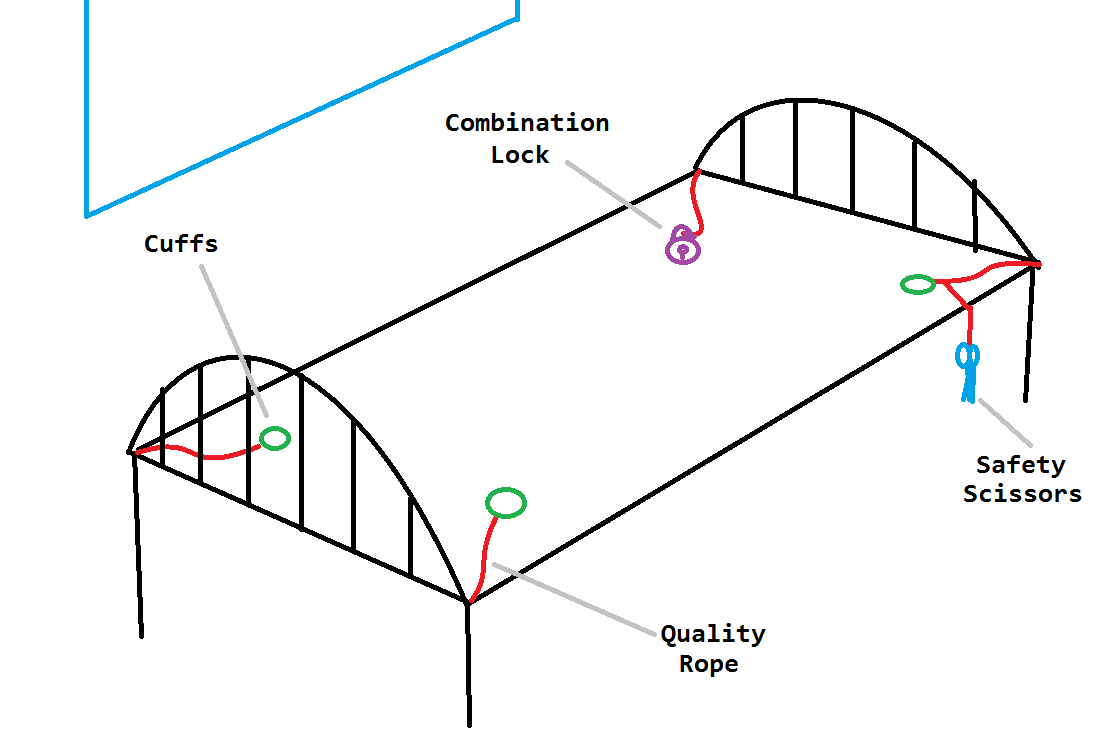 4x cuffs Expensive high-quality rope! (there's a point to this) Combination Lock A window Safety Scissors Now I usually start by measuring and setting up the rope on the four corners of the bed, three of them having cuffs attached. The fourth cuff will go onto one of my wrists (right hand for me as i'm right-handed). I attach a pair of safety scissors to the cuff end of one top-corner rope and let it dangle off the bed. Once i'm ready, I cuff both of my ankles to the bottom corners of the bed, then cuff my left wrist to the top corner of the bed. Finally I use a combination lock to cuff my right-cuffed wrist to the rope attached to the last corner of the bed. *click* Now i'm bound like this until one of two things: 1. I wait until sunrise so I can see the combination lock and free myself 2. In case of emergency, I cut the rope using the scissors. Now if I get frustrated and want to get out, i'd have to decide between either staying like that or cutting the expensive ropes. Seems I like these ropes more than my own freedom 😉 Now add your favorite gag and outfit (but not a blindfold) to this scenario, and you have a fun night ahead of you! 😁 |