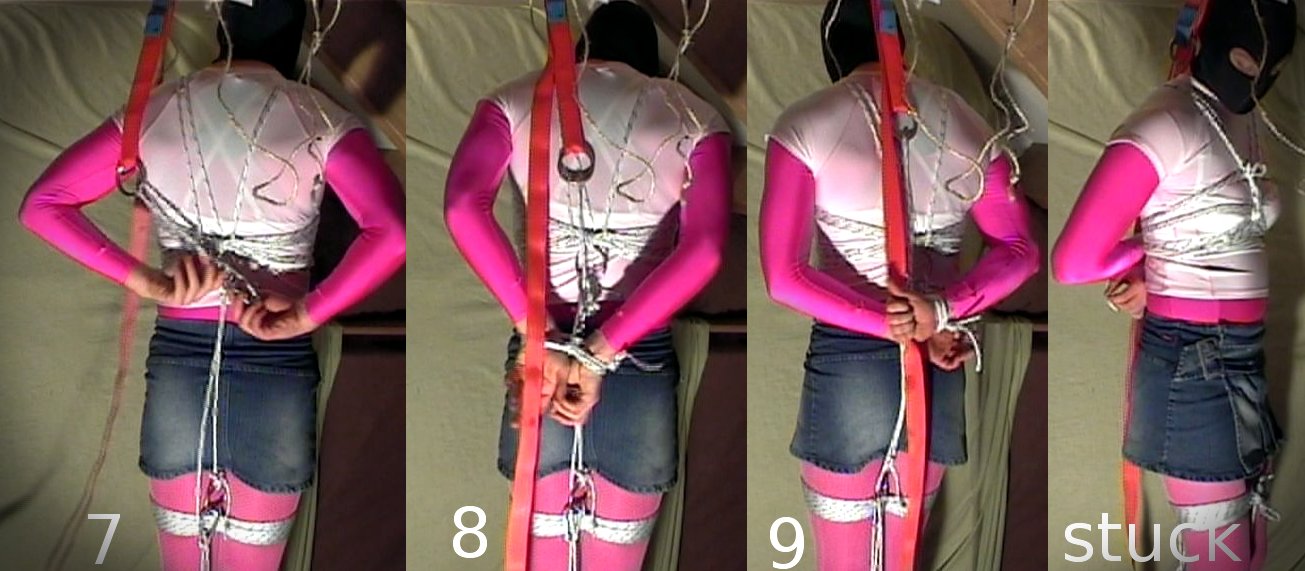 9. Now you are all set. Start pulling all the slack out using F. This is the point of no return. When the slack is gone your hands will be stuck behind your back and when you've done it right this position is already inescapable.