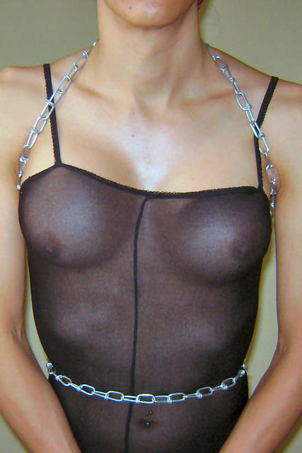 After a remission time in which I wasn't feeling very motivated, my urge to be in bondage came back. Then, I decided to take to practice a ew setup in which my hands were cuffed and fixed to my back. Here there are a couple of pictures that show how I achieved that with a chain: