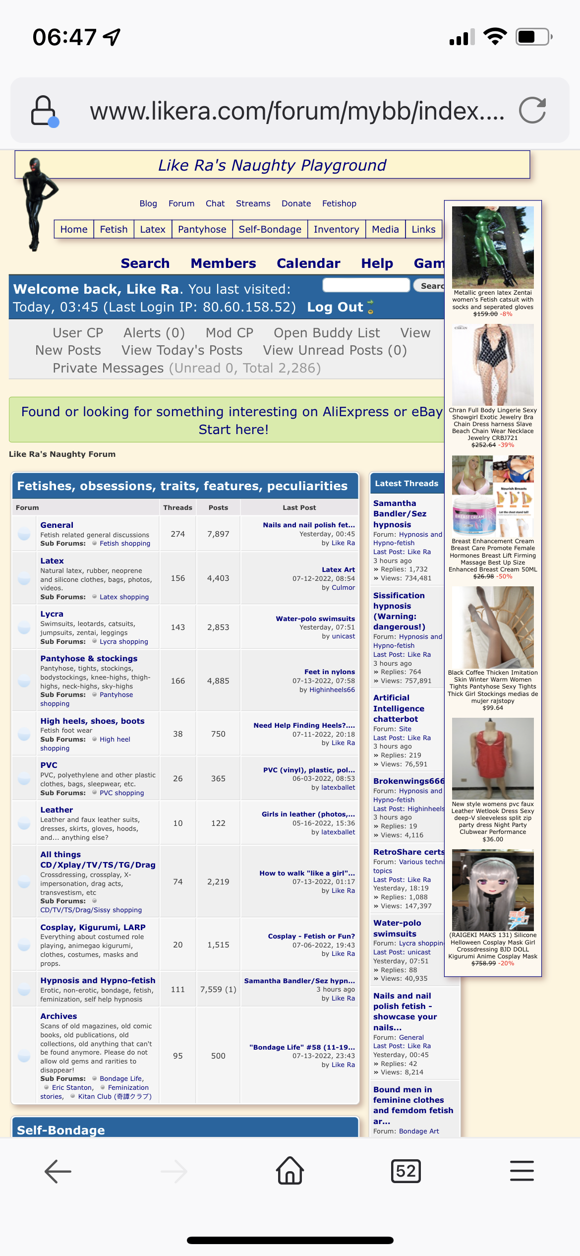The subject is being covered over with adds of items to buy. Tinker D dateline='[url=tel:1690378134' Wrote: 1690378134[/url]'] (26 Jul 2023, 14:32 )Tinker D Wrote: Getting this on my iPhone.So, it's getting worse.... A quick workaround is to click on any forum link, for example, this one: https://www.likera.com/forum/mybb/Forum-General As I said before, I have no idea what might cause this, as the templates look very similar, so: (23 Sep 2022, 19:19 )Like Ra Wrote: ... and if anybody has any ideas how to fix that, please! (26 Jul 2023, 18:15 )Like Ra Wrote:(26 Jul 2023, 14:32 )Tinker D Wrote: Getting this on my iPhone.So, it's getting worse.... Where is it supposed to be placed? (26 Jul 2023, 19:05 )molytery Wrote: Where is it supposed to be placed?See the Android screenshot here: https://www.likera.com/forum/mybb/Thread...3#pid62483 (26 Jul 2023, 18:15 )Like Ra Wrote: A quick workaround is to click on any forum link, for example, this one: https://www.likera.com/forum/mybb/Forum-GeneralHa! It does not work anymore! Oh, my... that's ridiculous ... OK, let's clean all caches here... Rebooting the server ...