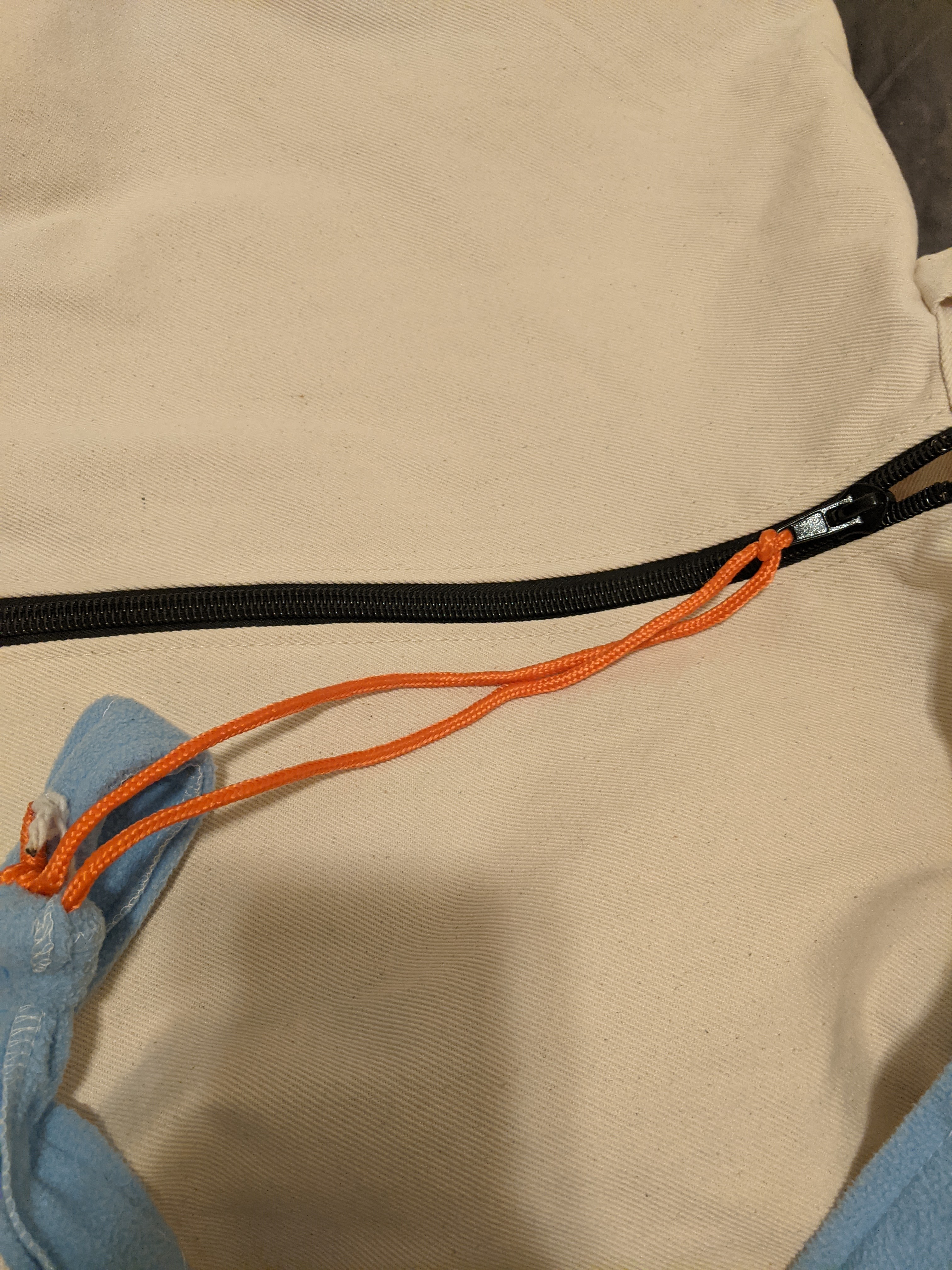 Basically, I was on my bed, inside my sleepsack. My arms were already trapped in the internal sleeves and the zip was just over my shoulders. All of a sudden I pulled too hard and the chord just snapped clean off leaving me trapped inside the sleepsack without an escape mechanism!