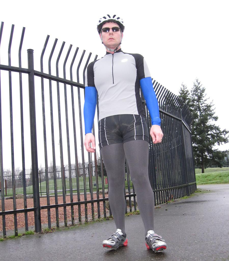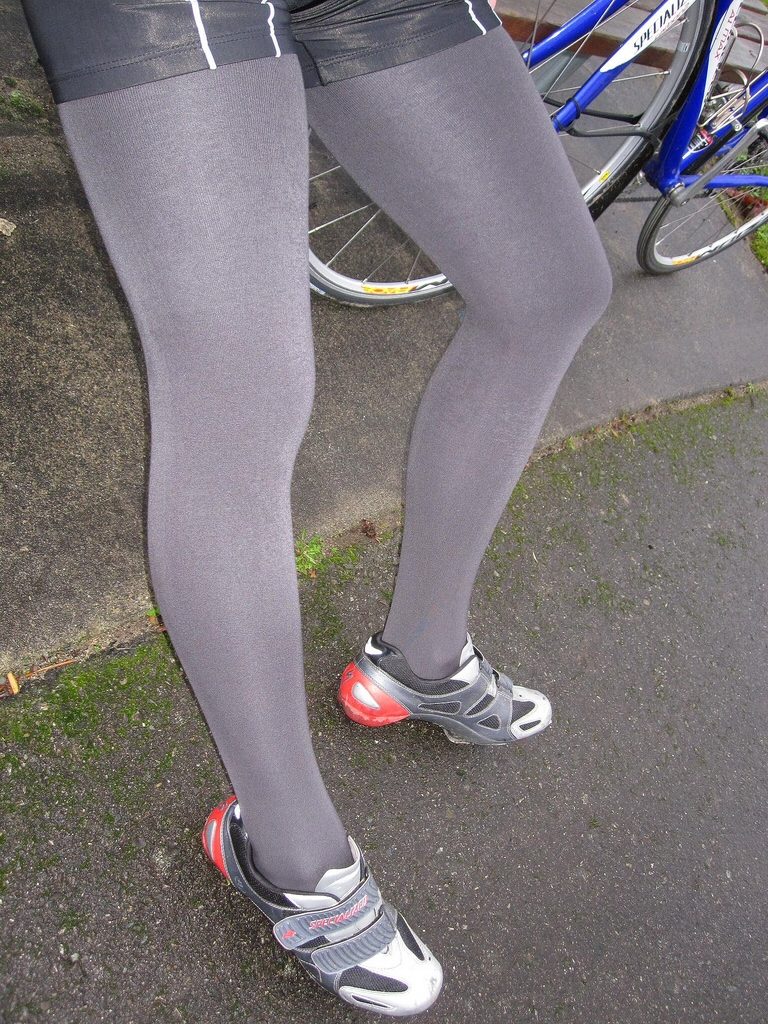 I love riding in women's footed tights, always get lots of looks!..The shiny Merona tights are worn over 2 additional pairs of tights, for a completely opaque look..worn under a Brook's lycra track suit (super short-shorts), and under armour spandex shirt under the red cycling jersey...The short-shorts of the track suit creep up even further when on the bike, exposing my tights even further!