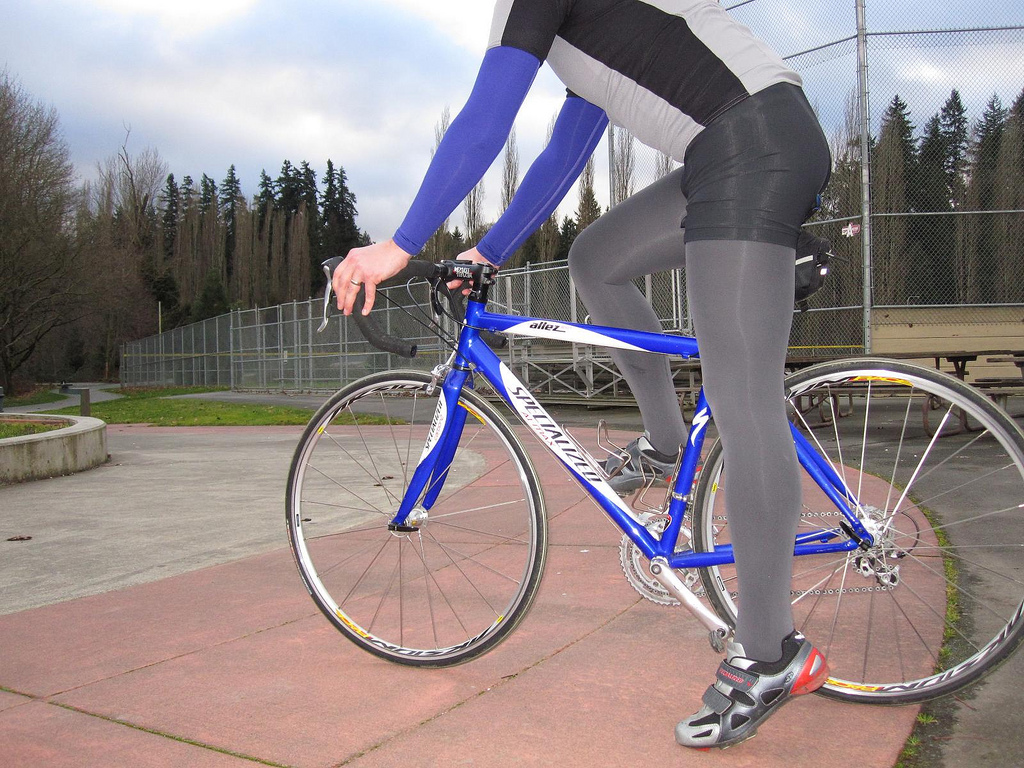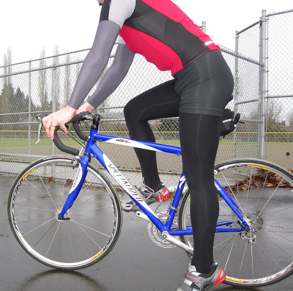 I'm wearing a women's Zoot tri suit over a pair of super-thin women's ISIS base layer leggings, over 2 pairs of footed tights. The shirt is a blue UA Metal Gear shirt under my tri suit and cycling jersey.