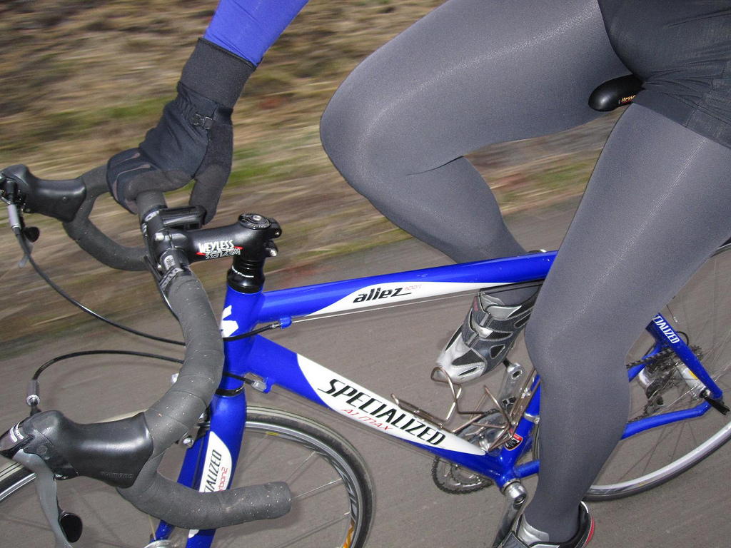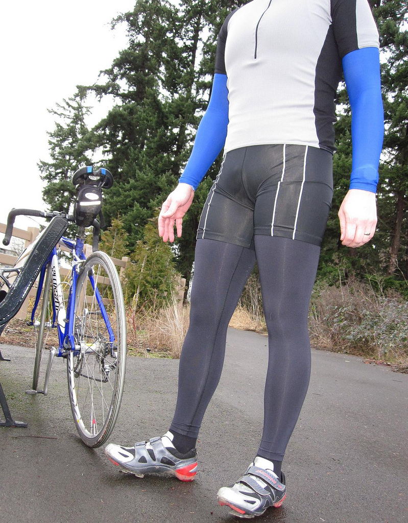 On this ride I wore thin grey footed tights (from Walmart) over 2 pairs of thicker black footed tights, for a completely opaque look. The spandex shorts are actually a one-piece track suite from Brooks, so it's like a leotard with shorts. The long sleeve shirt is a purple UA women's cold gear shirt...Worn over black tights, you can see the darker areas where the grey tights are stretched a little thin.