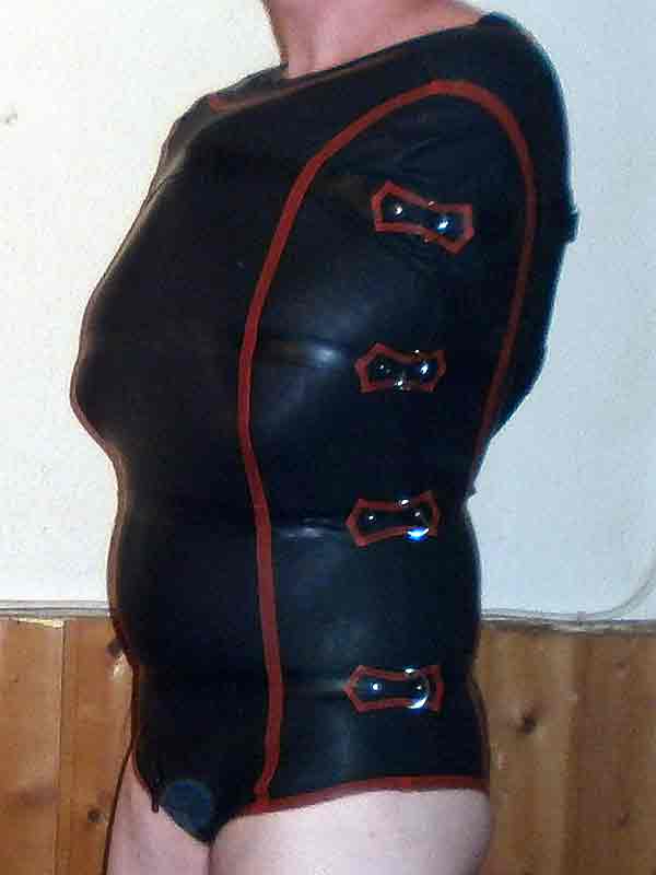 I took some more photos, to show, why I don't want to give up entirely. The lacing doesn't work, there is too much friction. The last image is the result of 5 minutes of hard work. I forgot to close the second buckle too. The back is wide open, but previously, I had pulled the suit over my head, with the upper buckle closed and the second one from the top almost. Another view, waist buckle closed here. I think, the upper half of the suit should be slightly wider. Not as wide as it seems from the pictures though. Probably one inch at the upper buckle, three or four inches at the one below. The upper buckle could be closed, if the suit were pulled up a couple of inches. I don't know, if that is enough for the second one, but as you can see on the second picture, the circumference needed at a higher position is less. I think, with my forearms in a horizontal position, it would be even less. Ok, this concludes this subject from my side. But I would like to see comments and suggestions from others. Do you agree with my assumptions? How should I take correct measurements? PS: I think, this suit is much cooler/hotter than a straightjacket.