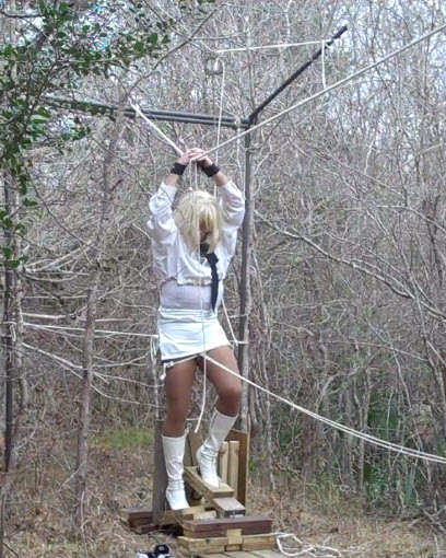 I’ve been working on a forced walking release but decided to try and use that release on stair climber after I did some stair climbing in stilettos the other day. I was surprise how hard it was going up several flights of steps in 5in stilettos. This is the first test of the release in real life. Until now the testing was just playing around in the shop. In this test I just used the quick clip release on my wrist cuffs and didn’t lock them as I normally do, and it’s a good thing I did. I had several problems that didn’t allow the release to work. I worked up a good sweat with 50 steps or so and I had to stop and check why it didn’t release. The first problem was the ratchet was setup up to screw the bolt in, that was a quick fix, just flip the switch on the ratchet. So suit up and get back on the stair climber and off I go, did about 100 steps or so and still no release, everything was starting to hurt, back, legs, arms, thighs, calf’s, so I unclip and check things out. Everything was working, tested it by hand moving the steps, ratchet was working then I realized the problem. I had screw the bolt all the way in with the first problem so it was going to be a very long climb before the release would work. Doing the math, every 2 steps turn the bolt 1/8 of a turn so it takes 16 steps for one thread on the bolt to disappear. I could count about 20 threads to so 16 time 20 equal 320 more steps and I had already done about 150. You want some pain, try climbing 450+ steps in stilettos. Well I had run out of time and my legs and thighs hurt already so the next session I go live. The emergency plan with be the stand ice melt that will let another key fall. Pictures below and I’ve upload a video and just waiting on conversion.