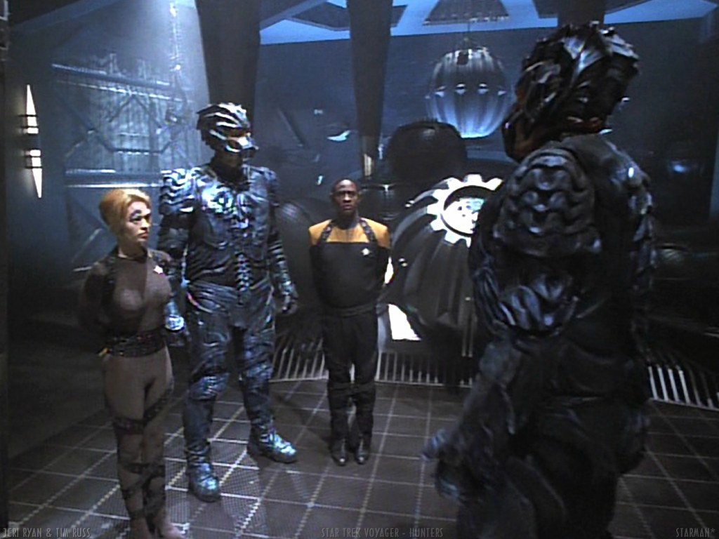 Do you recall the episode where Seven was captured by trophy-hunting aliens (edit: the Hirogen) and bound in a sort of high-tech straight-jacket?