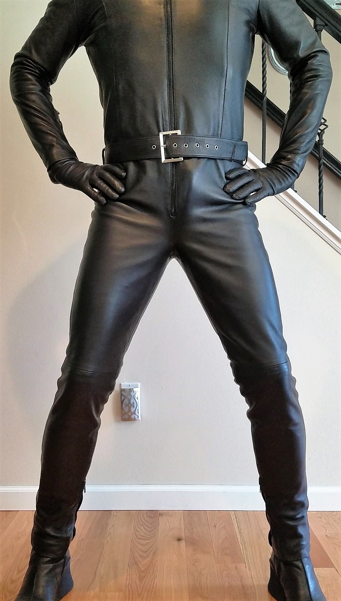 I woke up after a restless sleep because I knew I had planned this out. I dressed and left my room as I normally do while my wife slept. I then went downstairs, undressed and packed up my clothes for the other side of my trip. Then I slipped into my leather catsuit. I have a custom made leather catsuit that fits like a glove and has a full leather lining. There is really nothing like it. (From leder-deluxe.com which sadly closed)