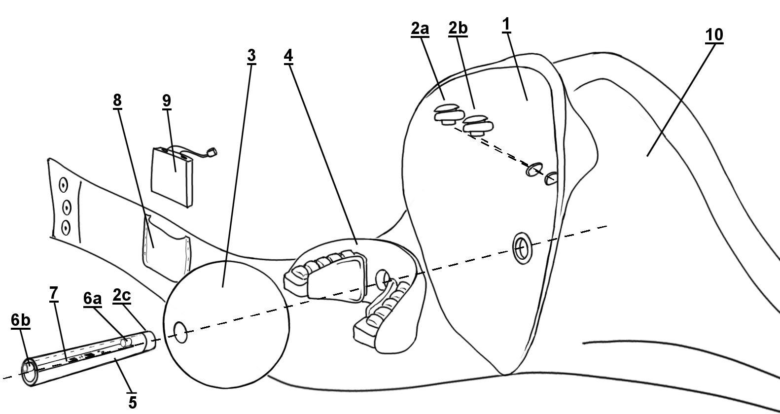 The gag "invented" for the story The Return of the Paramour aims at functions #1 through #4, but specifically not #5. The ball insert (3) deep in the mouth keeps the tongue down and blocks intelligible speech; the mouthpiece (4) and the valve system (2a, 2b & 2c) are to seal the mouth/nose cavity and enforce silence; the plastic cover (1) serves to make it impossible to do use lips (let alone teeth) to pick up anything; and while it would be easy to design the cover (10) so that the gag would look like a smog mask (or flu mask), it intentionally uses a substantially different design (so that people will recognize it for what it is: a gag).