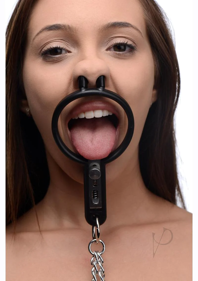 The idea is that the combination of nose probes(?) and the metal 'hook'(?) force the mouth to open wide.