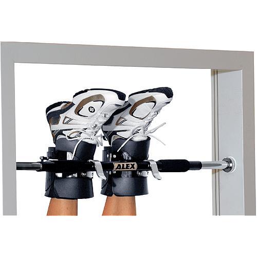 -- A pullup bar, or such a bar that is found in closets (where clothes hangers are hung), or a high jump bar; the bar must be such that it can be removed by simply lifting it off its supports; it is installed by depressing it firmly to its supports. The bar should be installed at your neck height or higher, and it should not be possible to remove the bar by shaking it, other than by lifting it firmly straight up. -- Cheap inline skates (rollerskates) that have room for the bar to fit between the frame (where the wheels are) and the shoe. Wheels not required. Ice skates work just as well, if not even better. Instructions: Place a tall chair below the bar. Wear the skates. Remove the bar from its supports and push it through your skates. Then lay on your back (or your neck if you can), on the chair, upsidedown, and with your legs, push the bar up so that you can place it and lock it on the bar's supports securely. You are now suspended upsidedown. You can push the chair away from you and relax. To get off, you will need to have enough stomach muscles (and your hands free) so that you can pull yourself up, grab the bar with one hand, and undo the skates with the other to free your feet. Do not attempt to remove the bar while you are attached to it, unless you can follow the exactly same sequence in reverse as when you attached yourself. After freeing your feet, you can just stand up and remove the skates from the bar. Combine with other techniques depending on your flexibility. (For example, this at the shoulders' level when you're hanging upsidedown.) Note that it is far easier to undo the suspension if your legs are separate than if they are bound together. Make sure that the way the bar is secured to its supports is robust, that the supports don't tear off the wall, and that the bar does not bend significantly when it holds your weight. If you are uncertain whether they hold, don't bind your arms, so that you can protect yourself in case the suspension fails and you fall. Also make sure that the shoes are robust enough that the frame does not tear off the shoes. Cheap plastic skates last for maybe a dozen of suspensions. Get them from e.g. second-hand. If you use iceskates, make sure that in no circumstances you accidentally cut yourself or anything valuable with the blades. Instead of skates, you can use other techniques for binding your feet to the bar. I used skates because I had them available, and because they could be easily used without having to worry about chafing or accidentally blocking the circulation in the feet. Skates can also be used as anchoring points for various hoist-based suspension schemes with the same advantages and disadvantages. http://www.karstadt.de/Alex/Tuerreck-63-...id=2712462