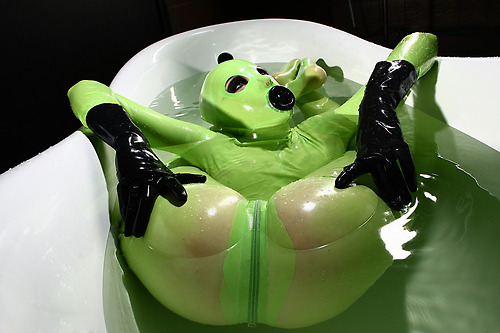 Green latex zentai and hot bath allow you to relax and flex 😉