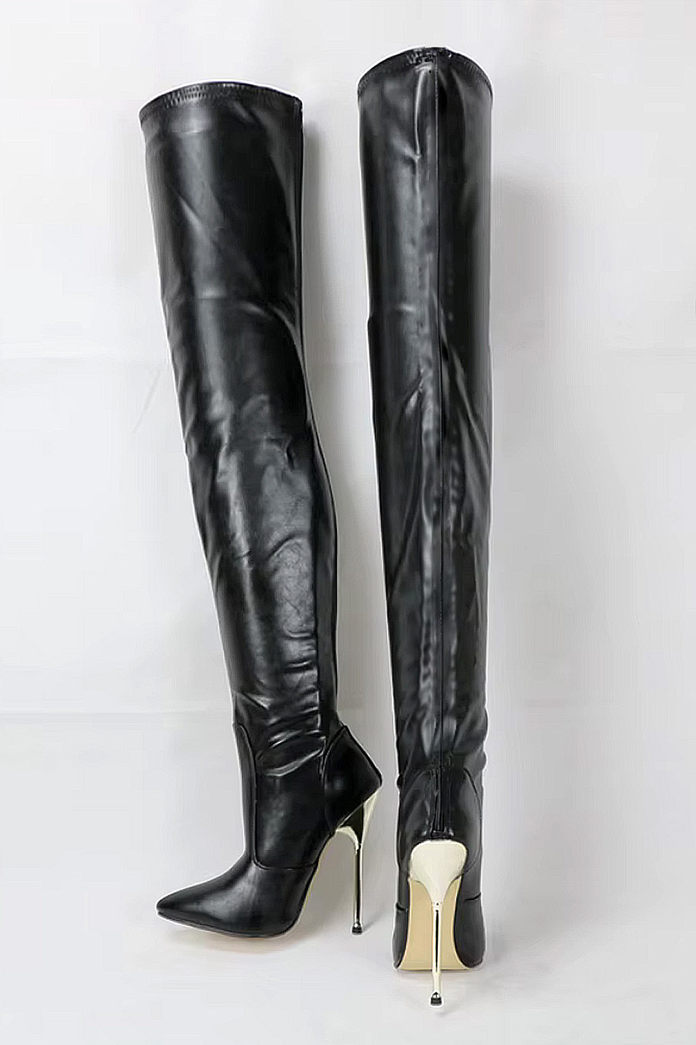 Once back in the changing room, Brian could not resist the temptation to peek into the mysterious white shoe box. There, he discovered a pair of lady’s black-leather boots. These were not just any boots! The leather was incredibly butter-soft and supple. Its sweet aroma filled the changing room. With their four-inch stiletto heels and pointed toes, these had to be the most awesome lady’s boots that he had ever seen. He began pulling one of them from the box—finding that he needed to reach quite high, to reveal the whole thing. The shaft of this boot had to be close to three feet tall!