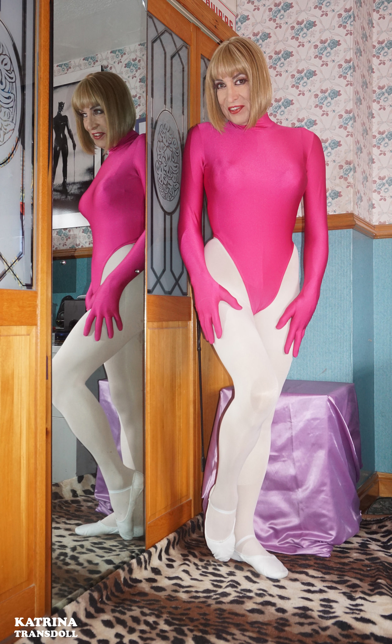 Here's Kat in a FetsFash leo with theatrical pink ballet tights and again with Wolford Neons in 'Gobi'.