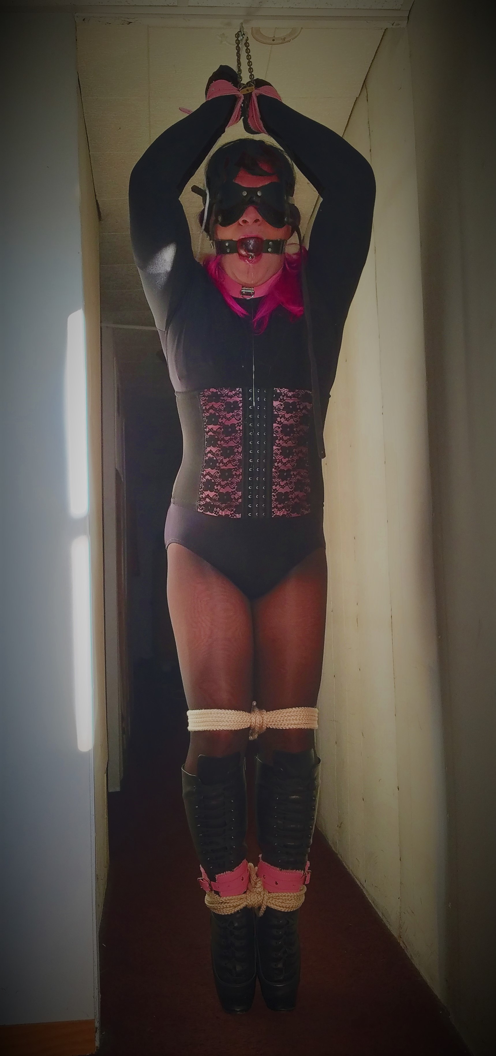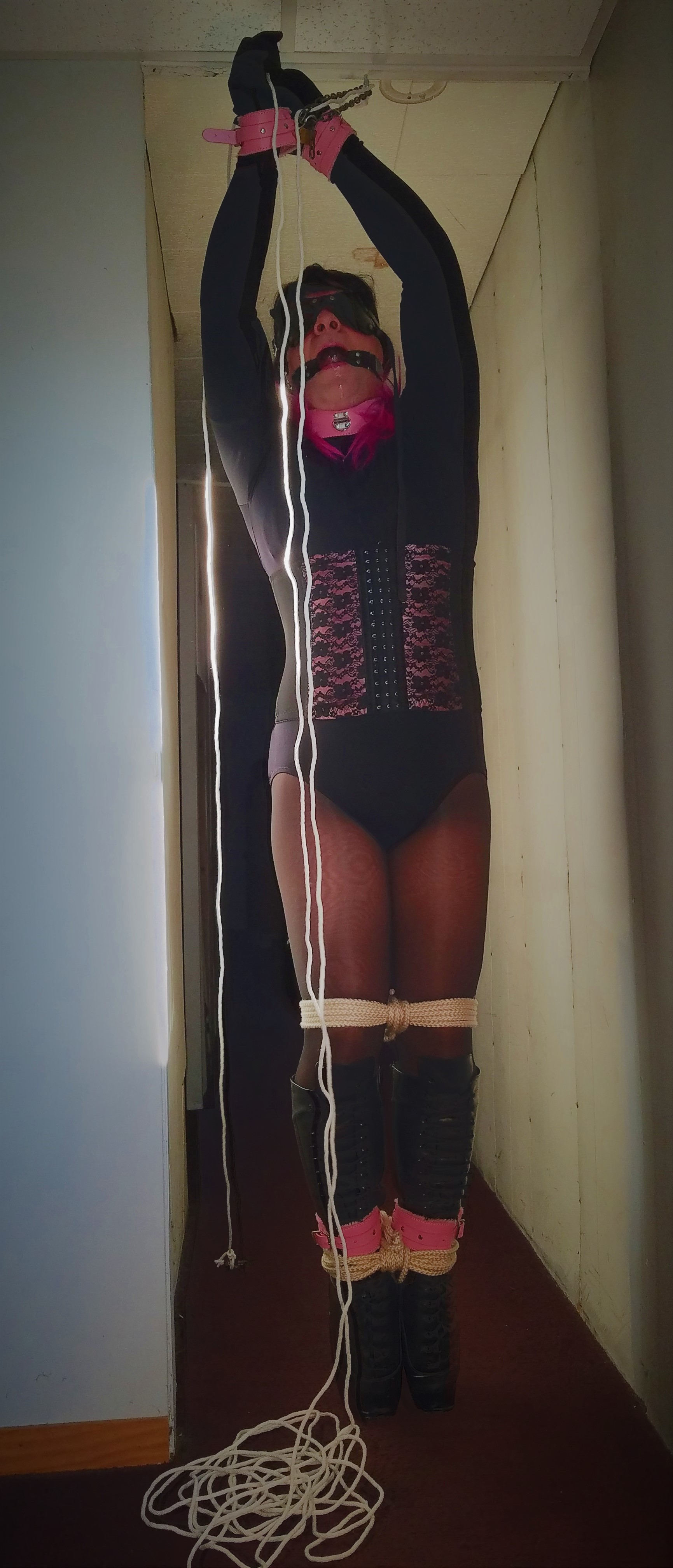 After reading here about self-bondage dares I decided to try one that was presented to me. For this dare I was wearing 3 layers of Leggs nylons, leather ballet boots, capezio leotard, gloves, clover clamps underneath a bra, 2" ballgag, and blindfold. The key release to the cuffs is on a 45' rope that is attached to the eyebolt where my wrists are cuffed.