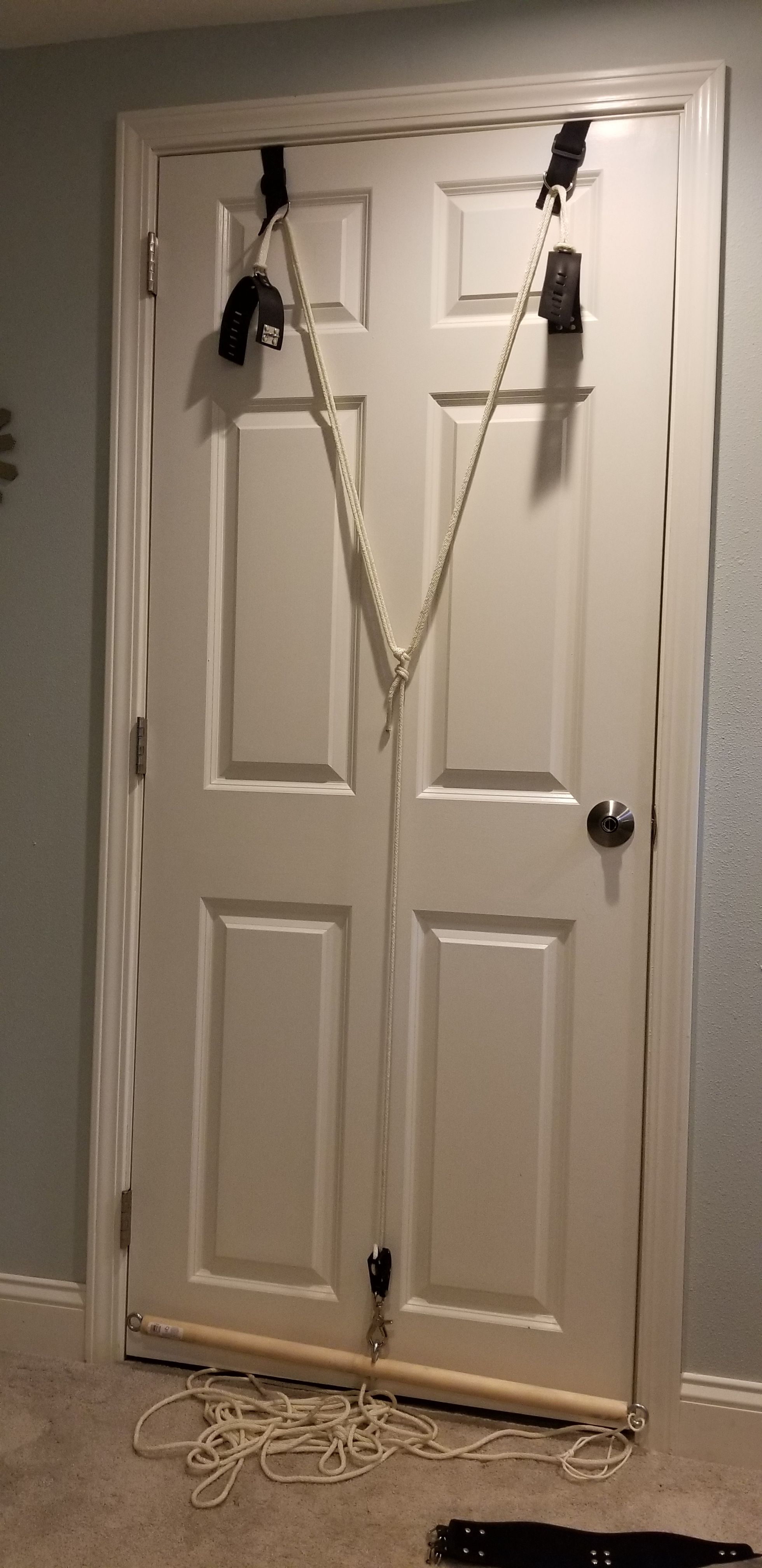 That doesn't mean I haven't been thinking about new-to-me techniques, though. Kind of like my recently-purchased hinged handcuffs, I've been eyeballing some way to securely and safely tie myself into a standing position. A few weeks ago, I thought about straps that go over the top of a door and are trapped by the door, which I found on AliExpress.