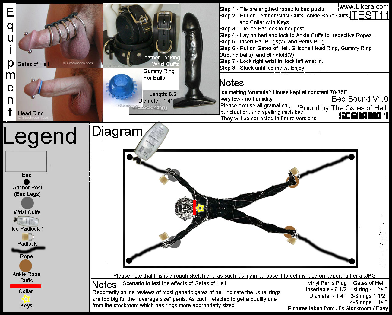A couple questions I have regarding this scenario is how to properly tie my wrists and ankles while being tight and restrictive. I have experimented with SRDs in the past and I have a tough time tying them off and keeping them tight. I figured I would lay on my bed with ropes tied to the bed legs pulled onto the bed. I would then lay as for the scenario(Spread Eagle) and stretch each limb to a fun but not too uncomfortable extent. Then mark with a sharpie on the rope where my wrist or ankle stretched to. Then I would tie the loops for the locks onto the ropes and remove up to possibly 1-2 inches in the slack to provide a tight bind. Any idea's on this? I plan on using fairly standard leather cuffs which should provide enough pressure displacement evenly to keep my wrist's circulation from being cut off. I plan on using tied rope cuffs for my ankles as I currently do not have a leather pair but I'm looking into several different sets and should have them soon enough. I plan on using the Ankle rope cuffs described here. Would this tie be fine for this scenario or would it put too much pressure on my ankles? Would the Single Limb Cuff be more suitable? If so do you have any ankle rope ties that could suffice? Also do you think sensory deprivation would compliment this scenario or not? By this I mean earplugs and an effective blindfold. I kind of want to see how I look tied down with The Gates of Hell on.....Hmmm what to choose, your opinion on sensory deprivation? Also I was wondering if anyone had any idea of a basic ice/time formula, as I plan to be in this position for 1-2.5 hours I need to figure out how many FL OZ this would require. FYI my house is a constant 70-75F but can be lowered or raised to my liking. There is next to no humidity here unless it's a rainy day which does not happen often as monsoon season has already passed. I'm also debating using a gag for this scenario as well. I have used belts and straps, duct tape, and pantyhose before. I plan to get a 2" ball gag soon or a penis gag but until the meantime I will have to manage. If anything I would use a pantyhose condom gag along with duct tape. Any problems with this? Thanks in advance for all your replies.