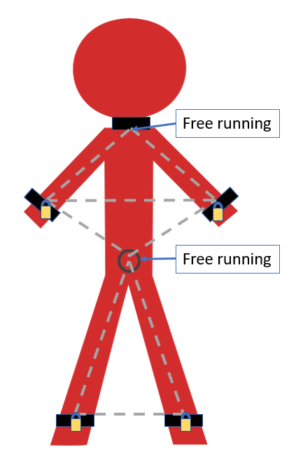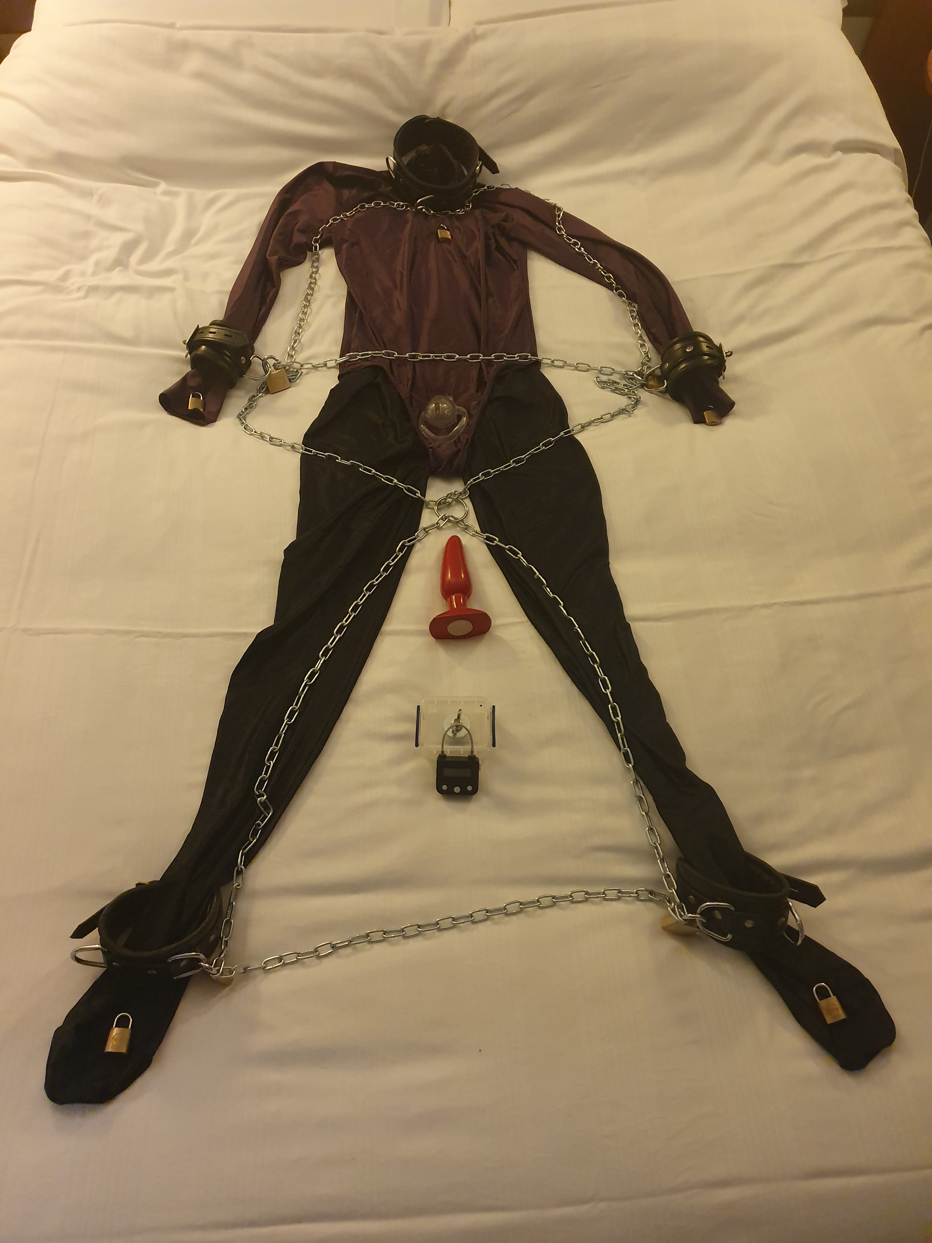 The plan this time is to sleep in a chainset... Things in the bag... Cuff set (wrist/feet/collar) lots of med weight chain (2 x 1.25m, 2 x 0.5m, 1 x 1m) 12 padlocks My key box and timer padlock ankles about 50cm chain between them and a triangle chain coming up towards the waist and through a floating O-ring Wrist triangle chain down floating O-ring and also up to collar All can slide through the o-ring and collar so i can walk around the room ok and have one hand up or down if i need to. May also link one direct between the cuffs.. locked Time... we shall see on what happens... but im working on 6+ hrs.. ie sleep time Ill take a photo of the set up when there. EDIT: now with graphic (This post was last modified: 11 Nov 2019, 22:40 by ltxrob.)