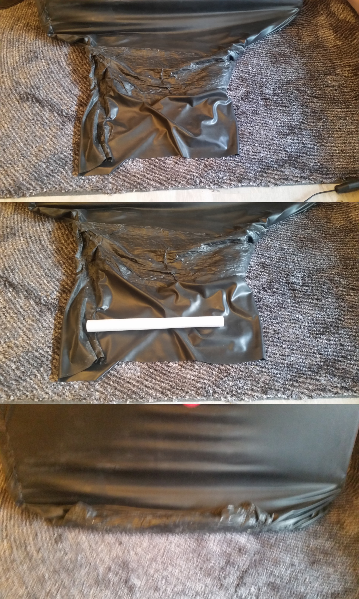 Oh and when making your frame, cut the PVC pipes shorter than 1m as the corners will add some odd 5cm; the slack will not matter much unless you REALLY care, but a too big frame will be a nightmare to assemble inside of the latex "bag" you're about to make. So yeah, keep that in mind and make your cube frame. Don't forget about vacuum inlet, I'd advise making it on the same edge you have your "roll up" entry to keep all the business on the same end.