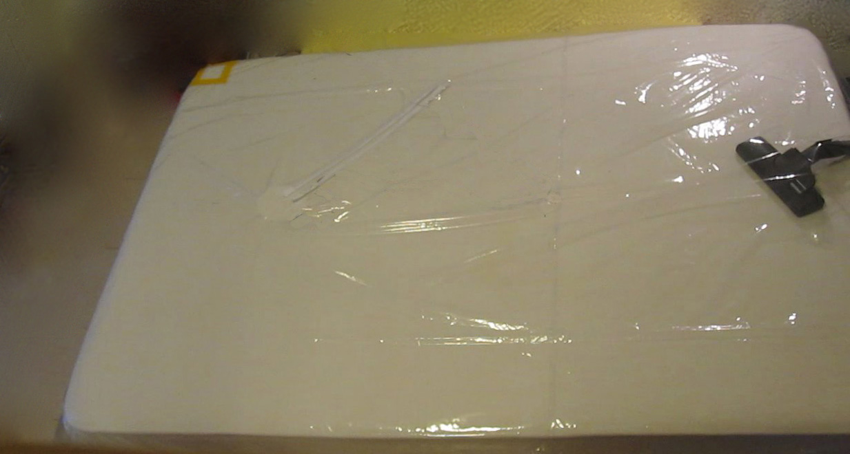 Taking the position, waiting for the vacuum timer. Notice the left hand under a weak patch on the bag, marked by yellow electrician tape - if the test went wrong, it can be broken by fingers to break the vacuum. Otherwise, the PVC sheet is pretty tough and I don't think I could break it without a tool.