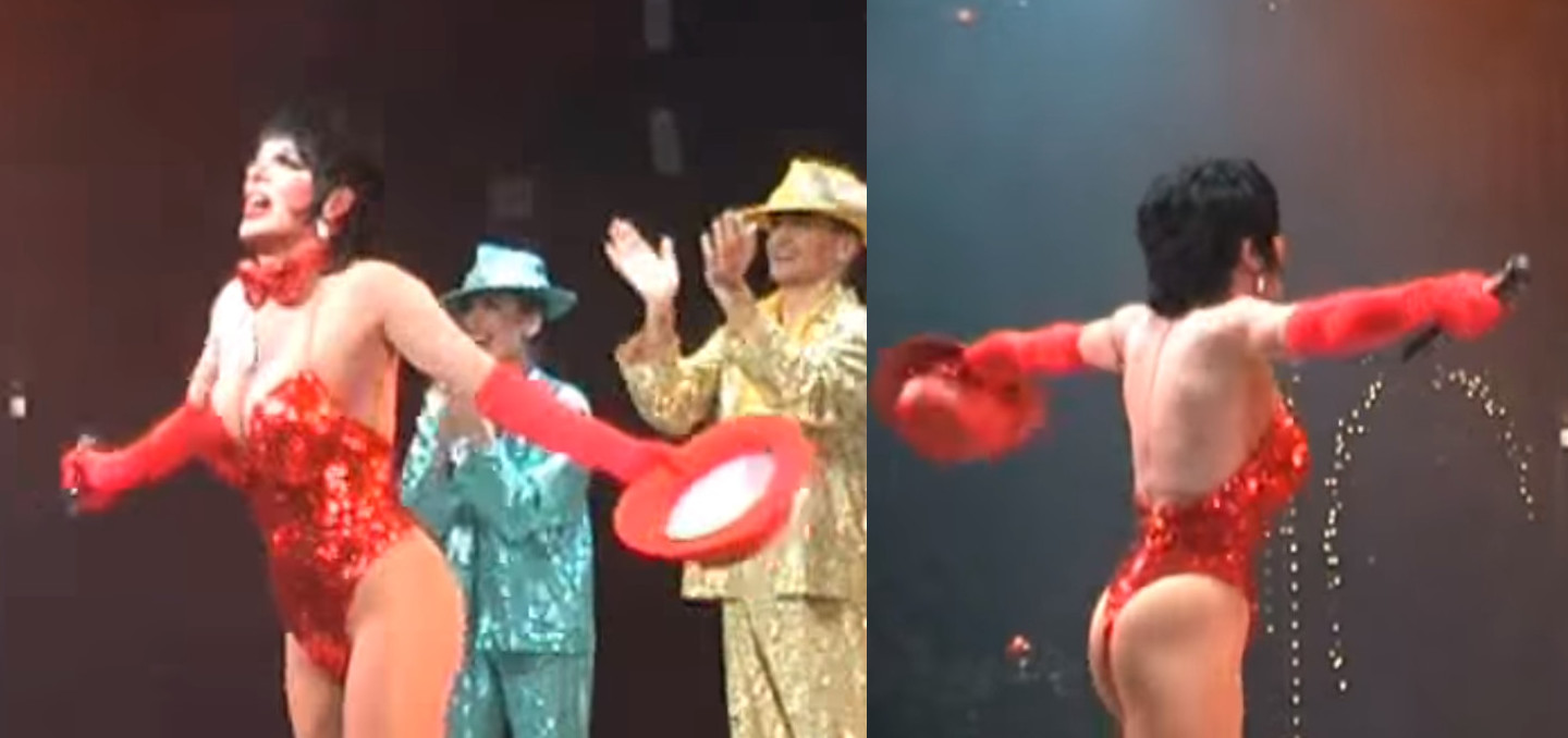 Derrick Barry as a tribute to Britney Spears- sheer and sparkly leotard and tights,